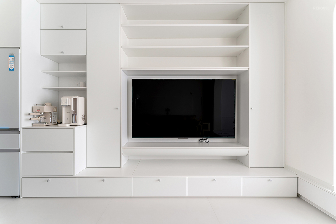 堆叠的模块组合,根据不同置物需求调整尺寸。落地部分做了加深的抽屉,与20cm高的地台平齐,深度60cm与左侧冰箱、水吧台统一。电视柜两侧深度35cm的封闭书柜,调整视觉对称感。