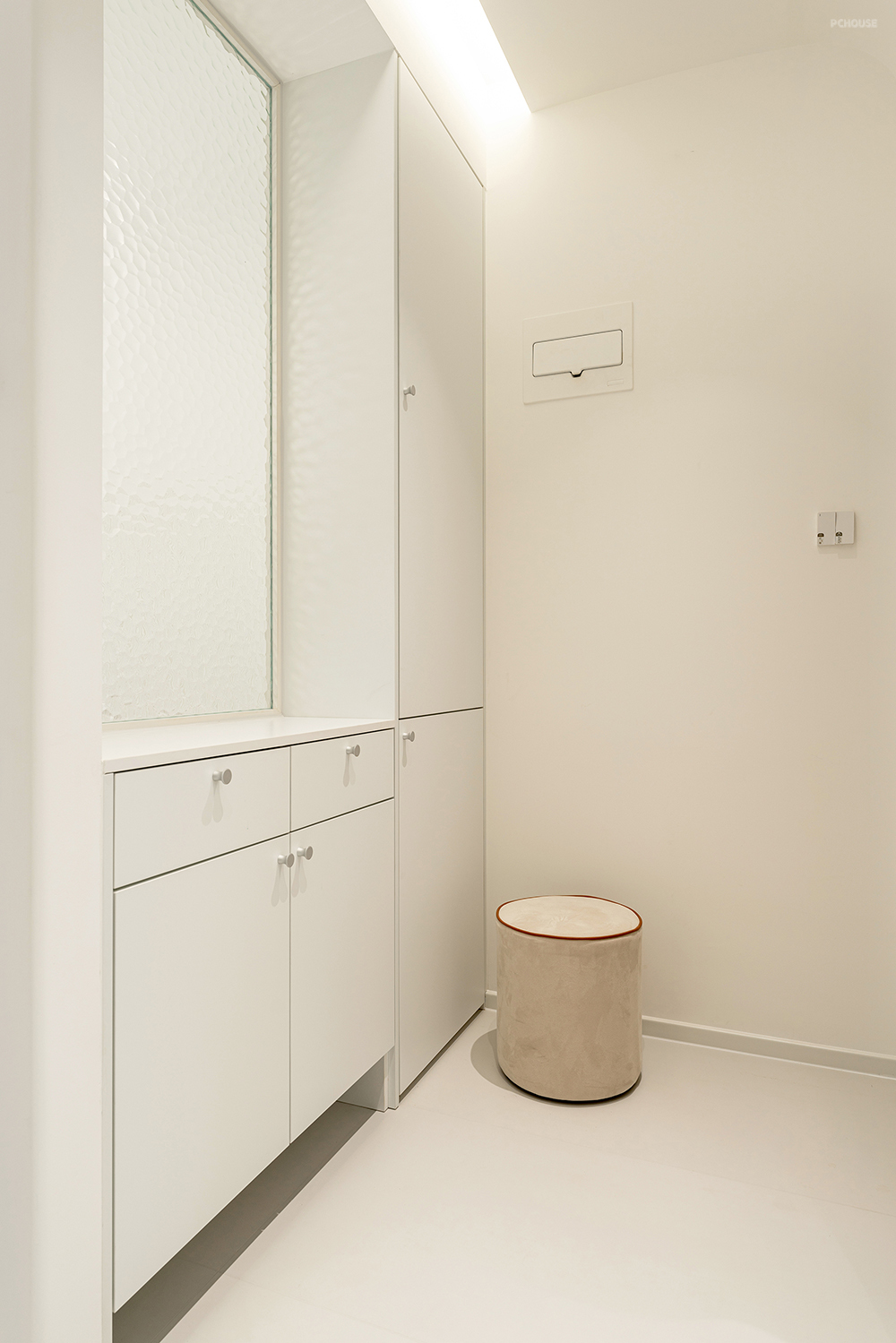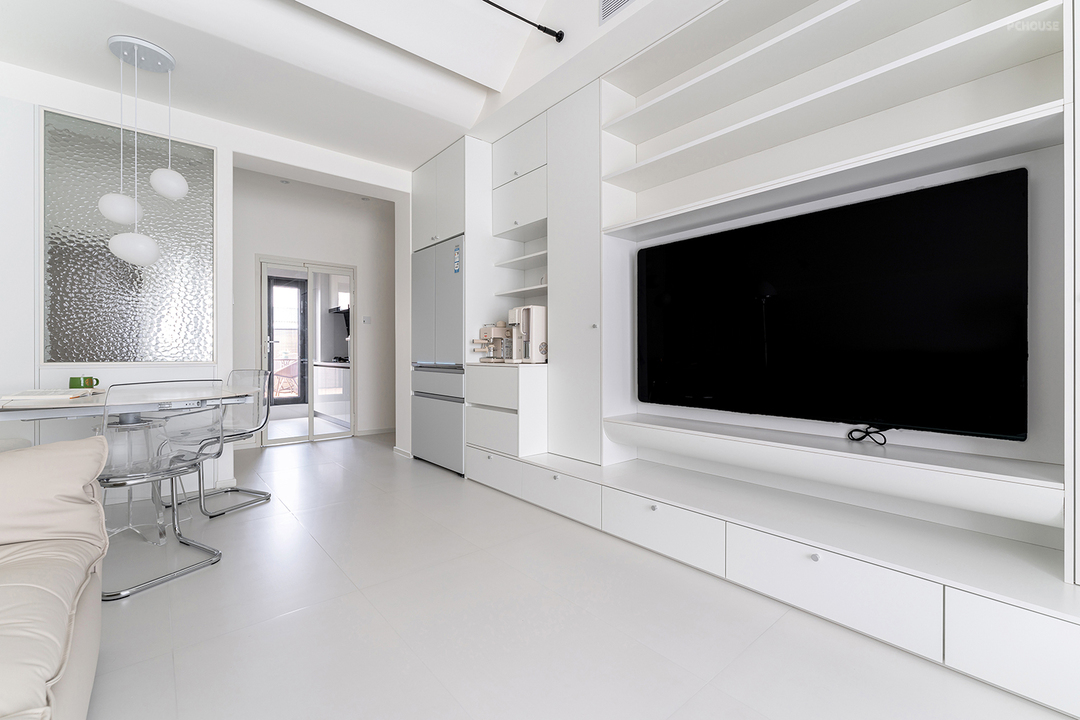 隔断由高柜和底层鞋柜组合,中间连接一面超白水波纹玻璃,给客餐厅提供视觉遮挡,光线还能延伸到门厅,透光不透影的朦胧效果就有了。