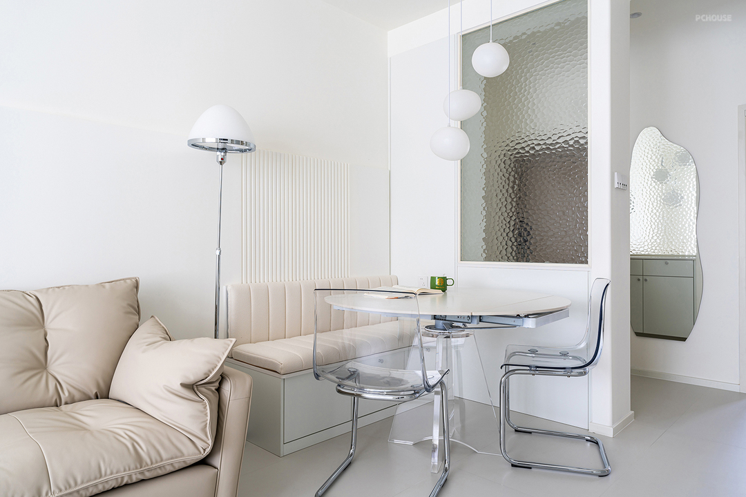 直径1.2米的圆形餐桌,满足多人用餐需求。落地卡座舒适,且能增加些许收纳。水波纹的超白玻璃隔断让餐区增加一丝浪漫气息~