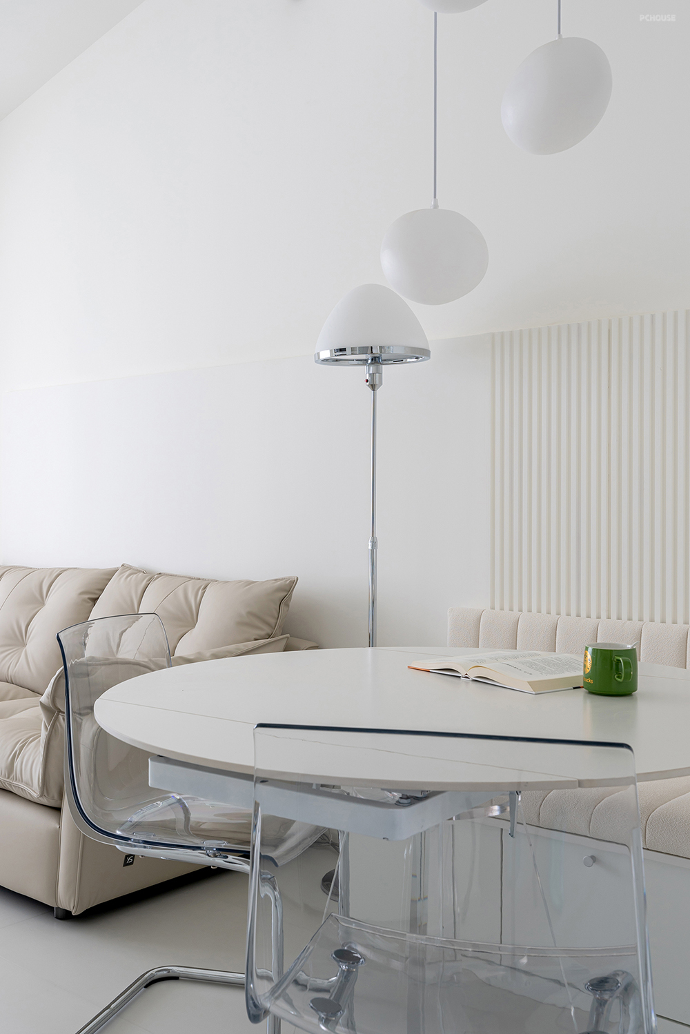 最抢镜的就是餐区了,一字型卡座+极简圆形餐桌,不占空间还能最大限度同时容纳多人用餐。色调与材质的统一,营造干净整洁的氛围。除了就餐,剩下的时间还可以是一个非常完美的办公阅读区。