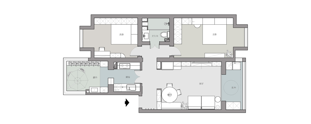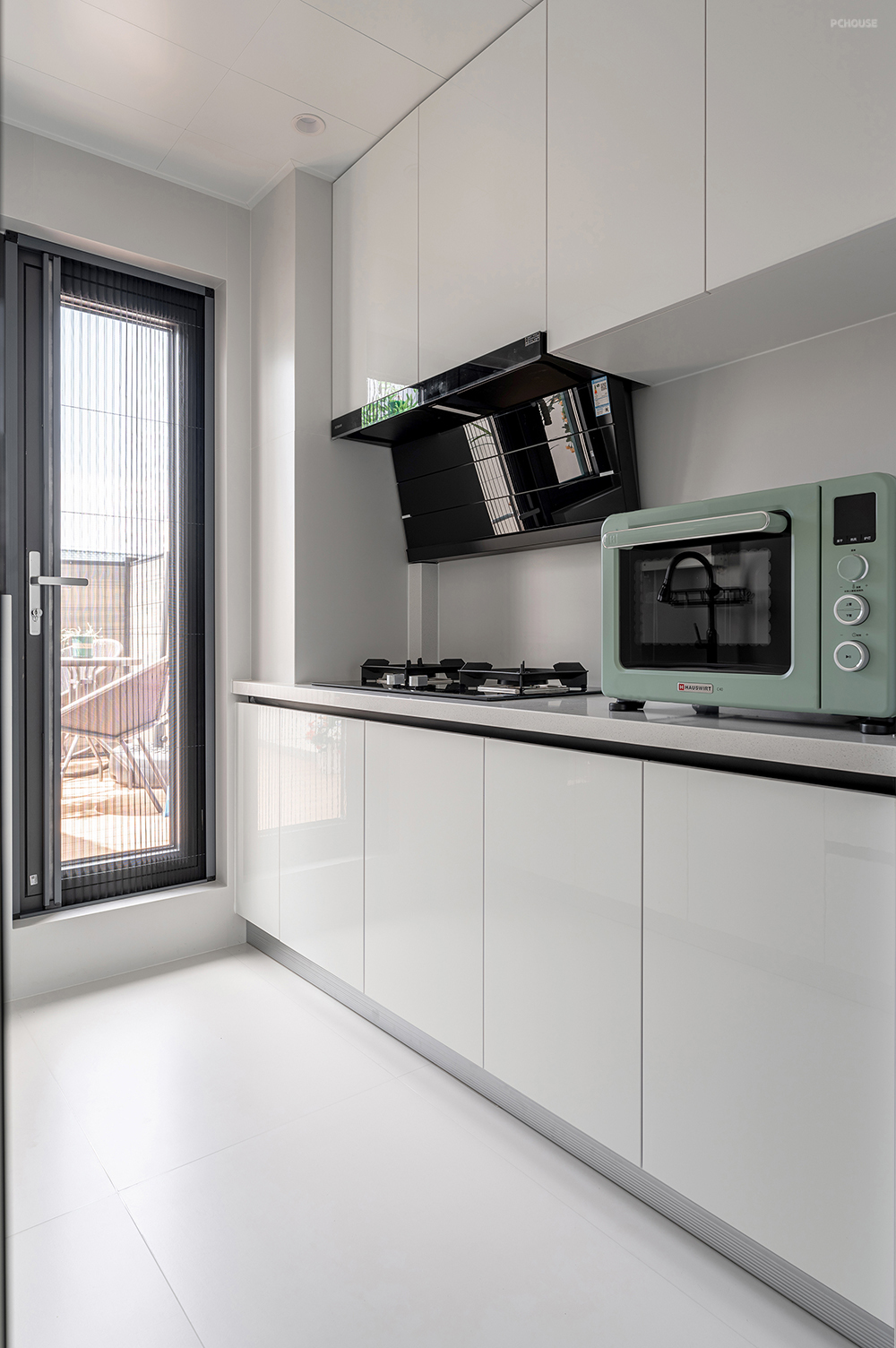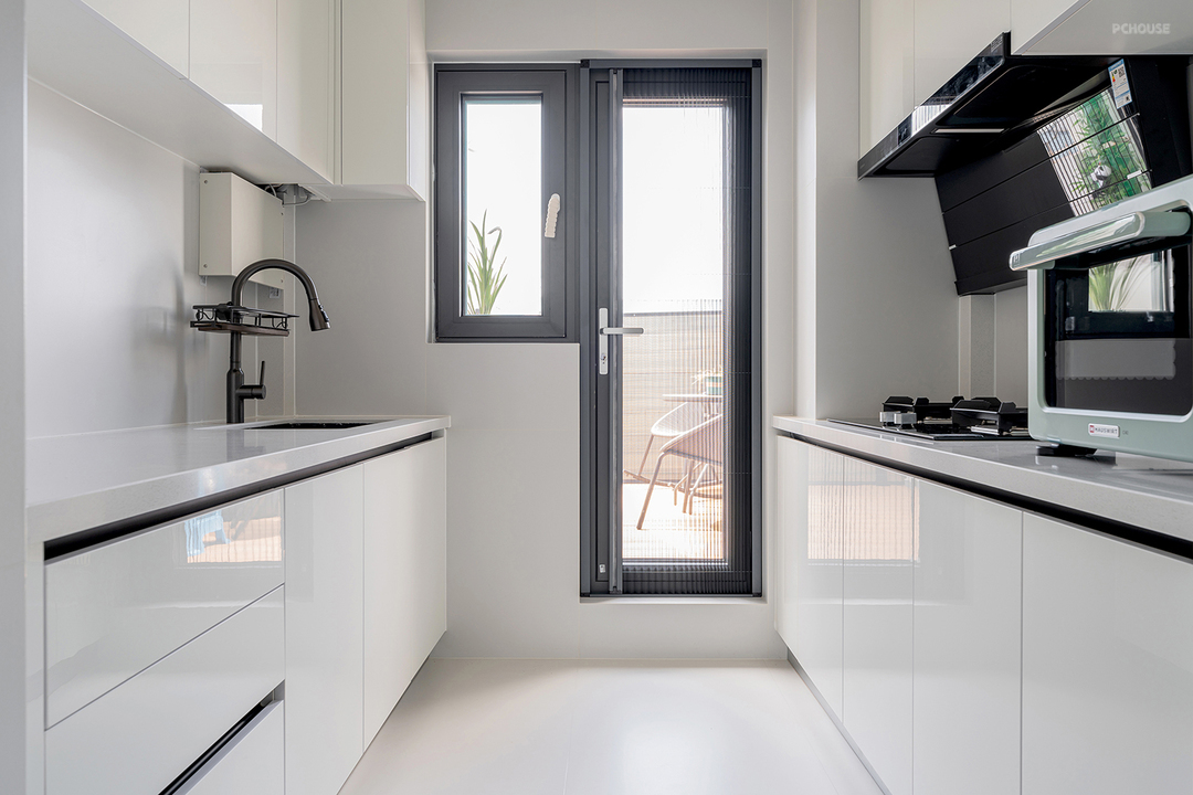 厨房双侧都是一字型操作区,满足洗-切-炒-盛的顺序,提供高效的使用动线。