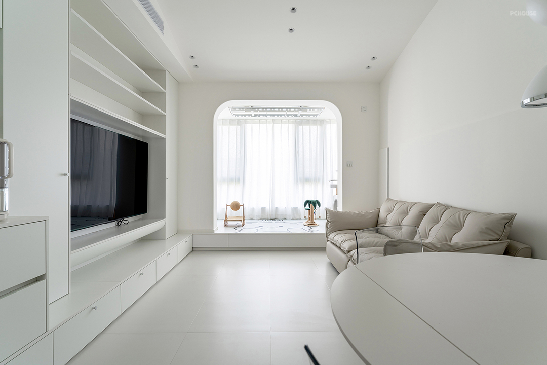 奶白色微水泥瓷砖通铺客餐厅,一直延伸到厨房。整个空间充满了温柔的气息与高级的质感,统一的配色下通透感十足。