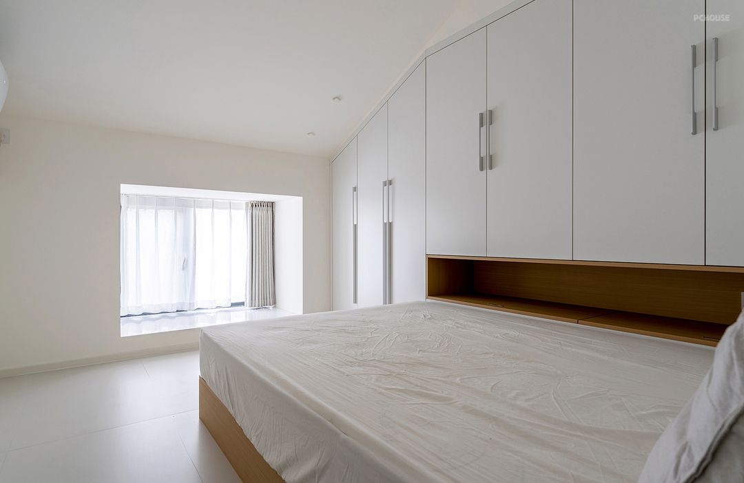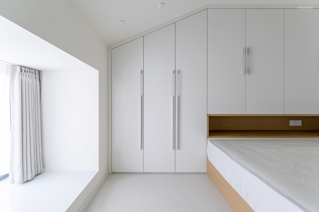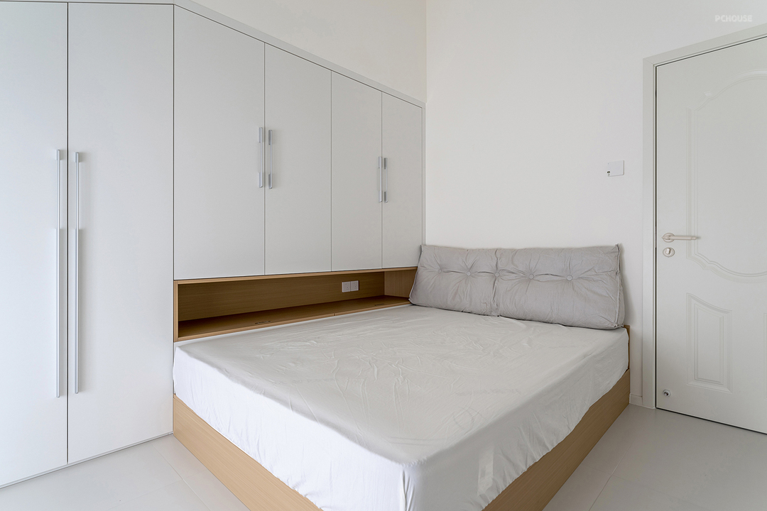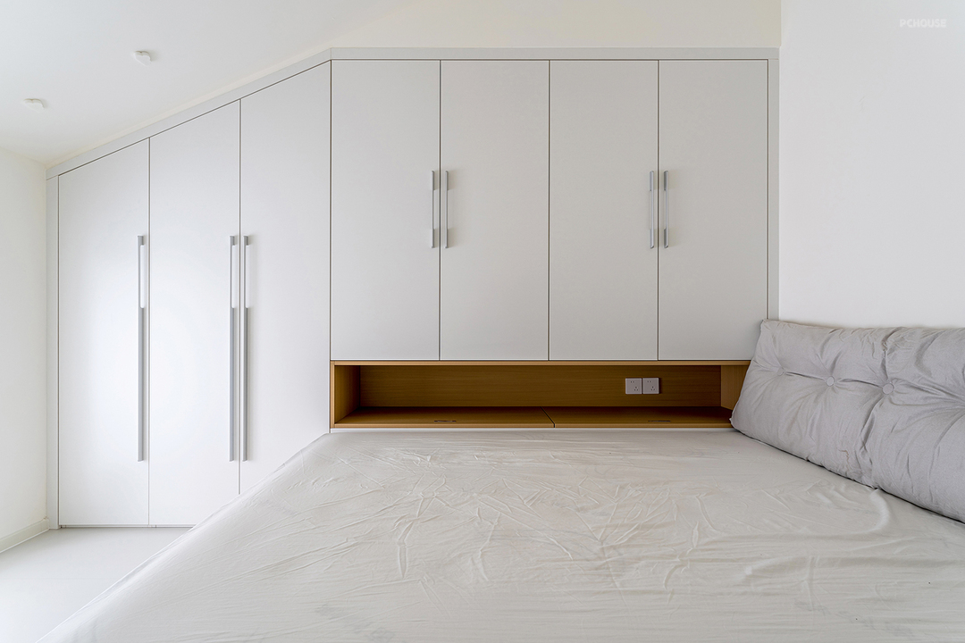 地台床一侧做通顶的柜体,整洁的墙柜空间增加更多储物量。床边留出一长条格子,随手置物的空间很好用。