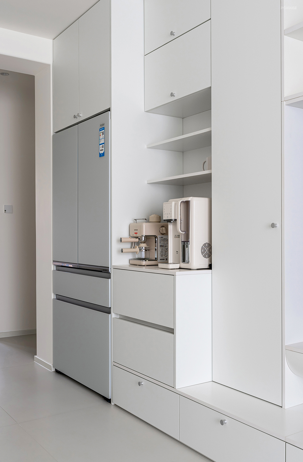 冰箱高柜深度60cm,外观平整的零嵌式效果丝毫不突兀。右侧同宽的水吧台,上面是杯子展示区,台面下方留两组抽屉,零食、茶叶、咖啡都可以收纳在此。