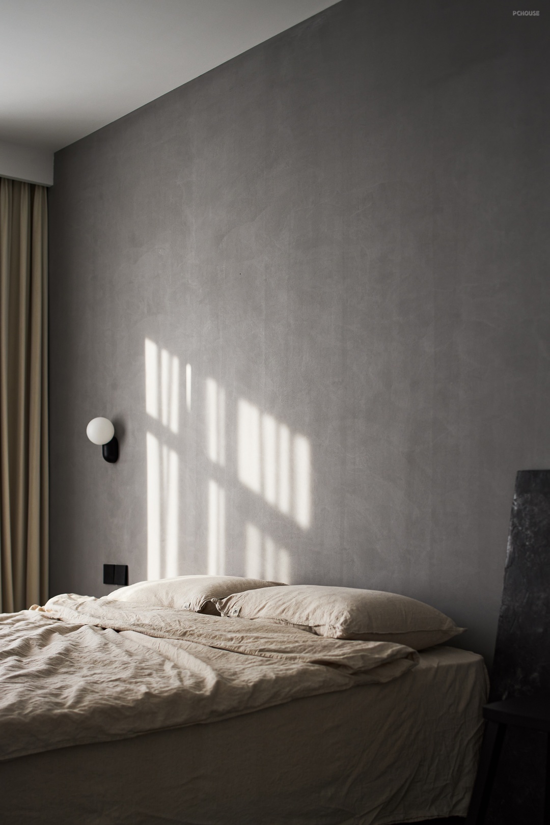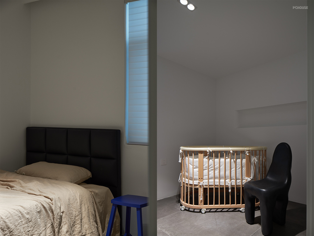 - 主卧沿用了水泥艺术漆的材质,无床头设计的慵懒态度,主卫的干湿分离,洗衣机抬高避免弯腰带来的困扰,立面细节上整理分类储物。