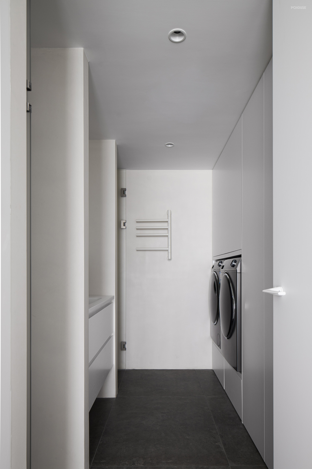 The master bedroom uses the material of cement art paint, the lazy attitude of no bedside design, the separation of dry and wet in the master bathroom, the washing machine is raised to avoid the trouble caused by bending over, and the details of the facade are sorted and stored.