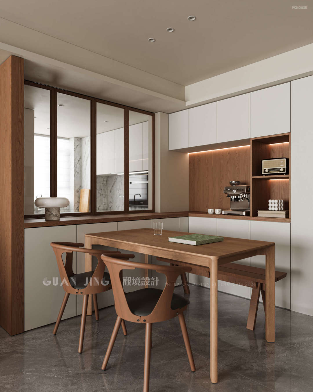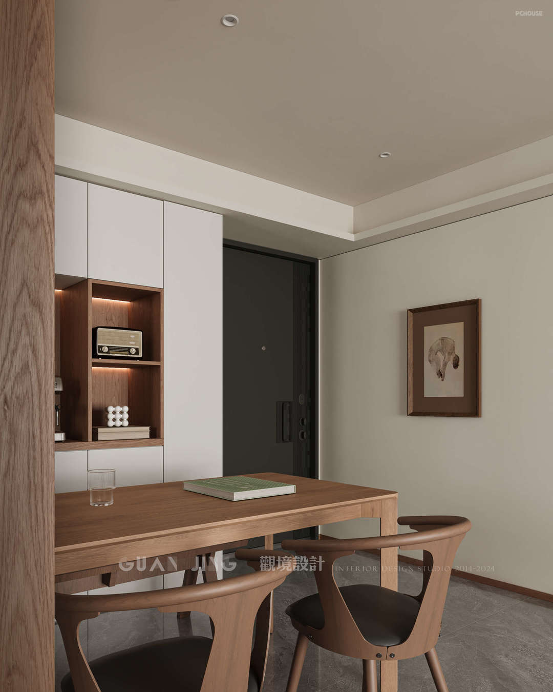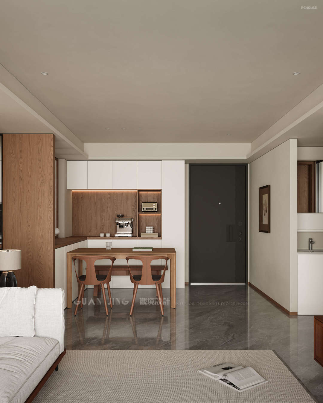 屋主喜欢极简的空间氛围,保留一些原木元素,保留正常两房加一个多功能间格局。希望餐厨动线短的同时拥有一个早餐吧台,但中厨使用时作为封闭厨房使用。将阳台并入室内空间。节约预算的同时希望原始精装能有较大改观。设计师们开始寻找这些想法的设计属性,巧妙地在空间中找到各自功能属性的平衡点,最终形成了极简主义与原木元素相融合的个性化室内空间。