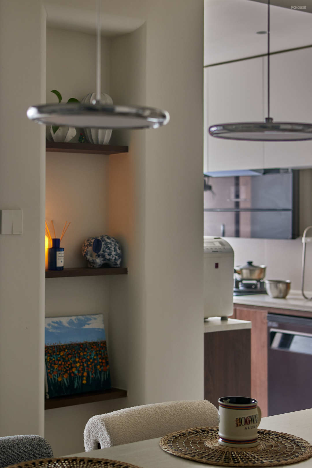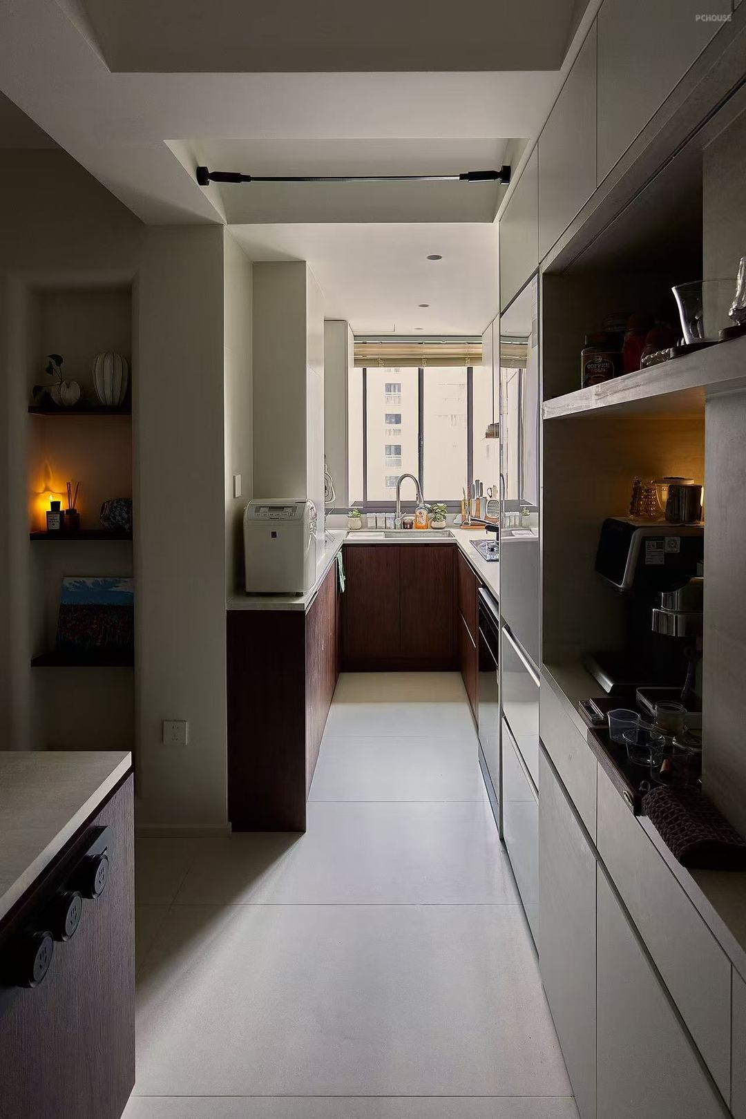 在设计中,注重材质与色彩的搭配:暖白色墙面与胡桃木家具的组合,营造出一种温暖而精致的氛围;灯光设计上,天际线灯带贯穿西厨整个空间,为小宅增添了一份温馨与层次感。