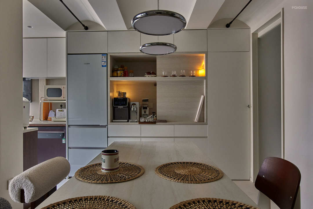 拆除原始厨房隔墙,打造开放式厨房,餐边柜与烟道完美结合,既实用又美观。岩板台面与奶油白柜体统一色调,质感温润。