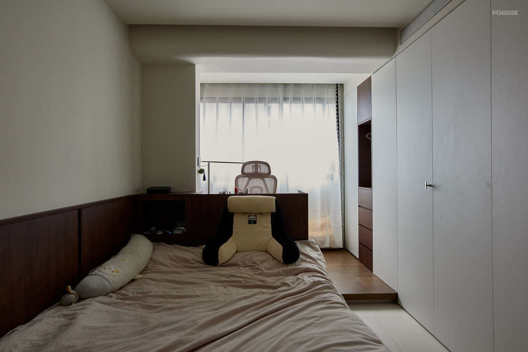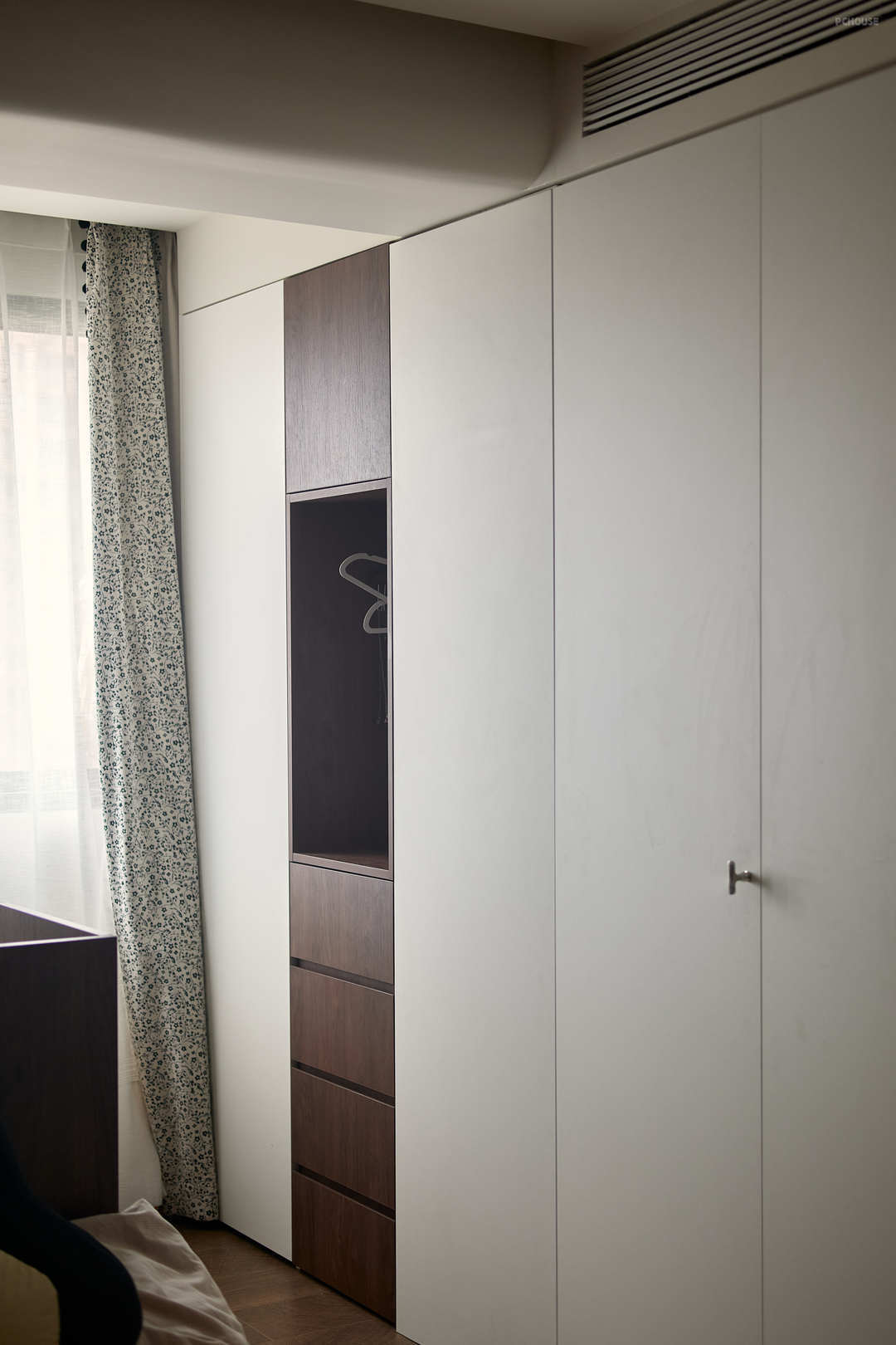 暖白色是根据乳胶漆颜色特地调制的,它柔和而富有温度,能够与墙面完美融合,营造出一种整体感与和谐感。胡桃木则以其天然的纹理与深沉的色调,为衣柜增添了质感与层次感。