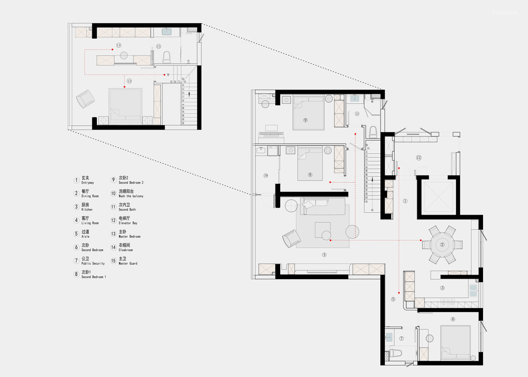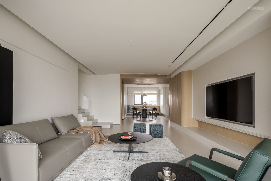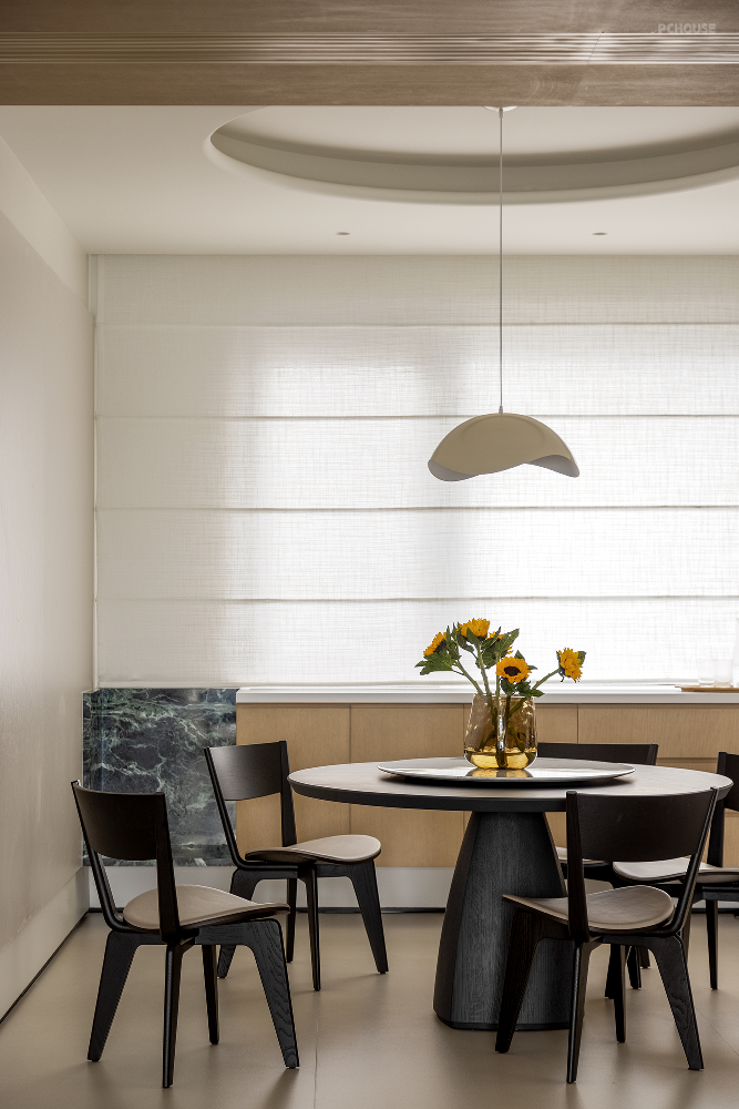 客餐厅分别连接主脉络两端,南北窗互相穿透,自由游走于宽阔朗逸的空间场域,围合出情感聚集的能量场,促进家人之间交流互动。