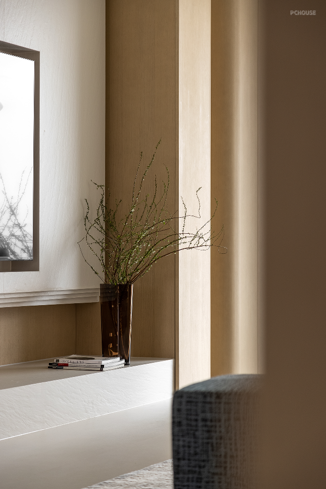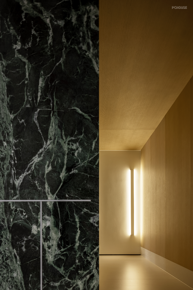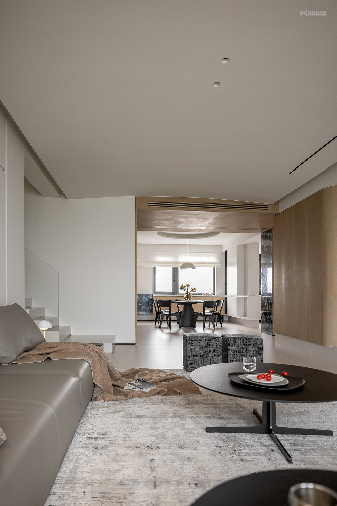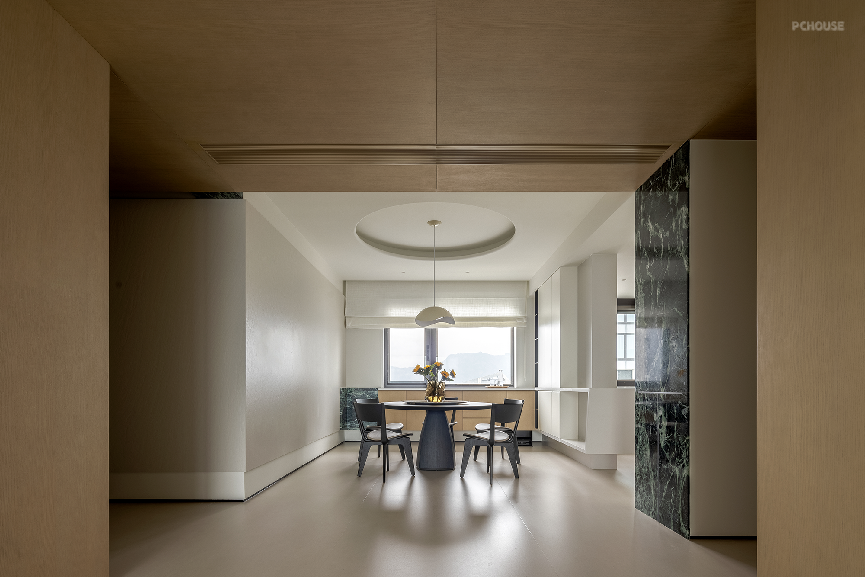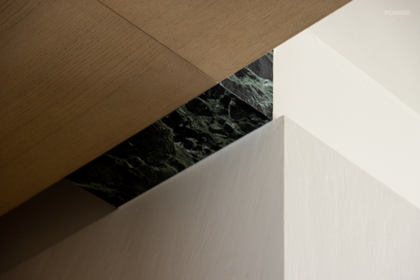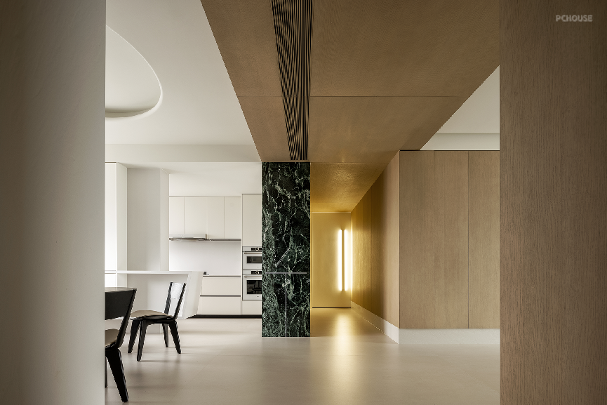 主线过道通过顶面的纵向铺展,制造视觉延伸感。从客厅横切过道直至厨房,不同材质、肌理、光泽拼接连贯形成一体,随视角切换而舒展跃动。细观结构形体的比例关系,平衡嵌合木质、石材立面线条,打造秩序感的空间整体。