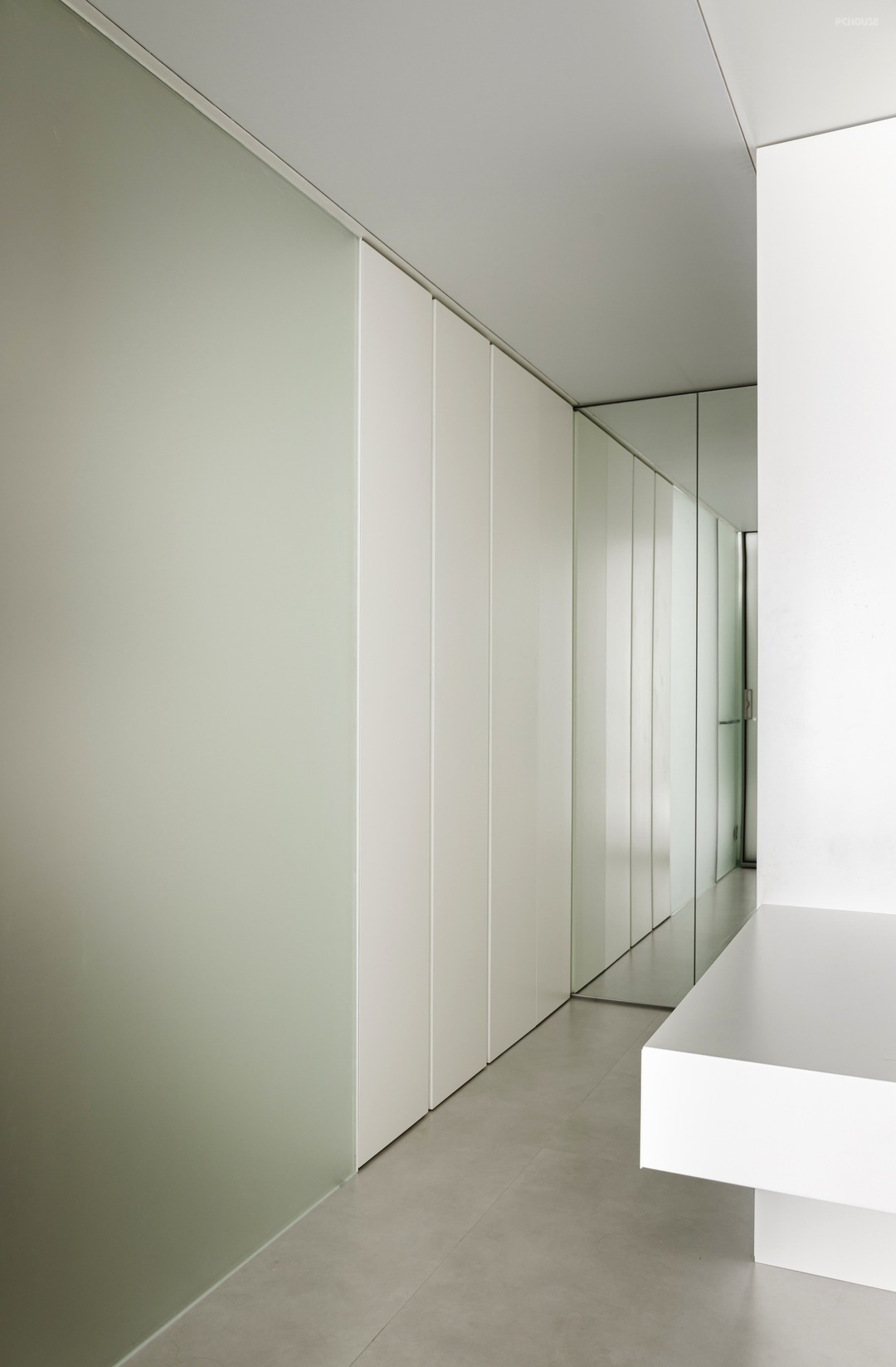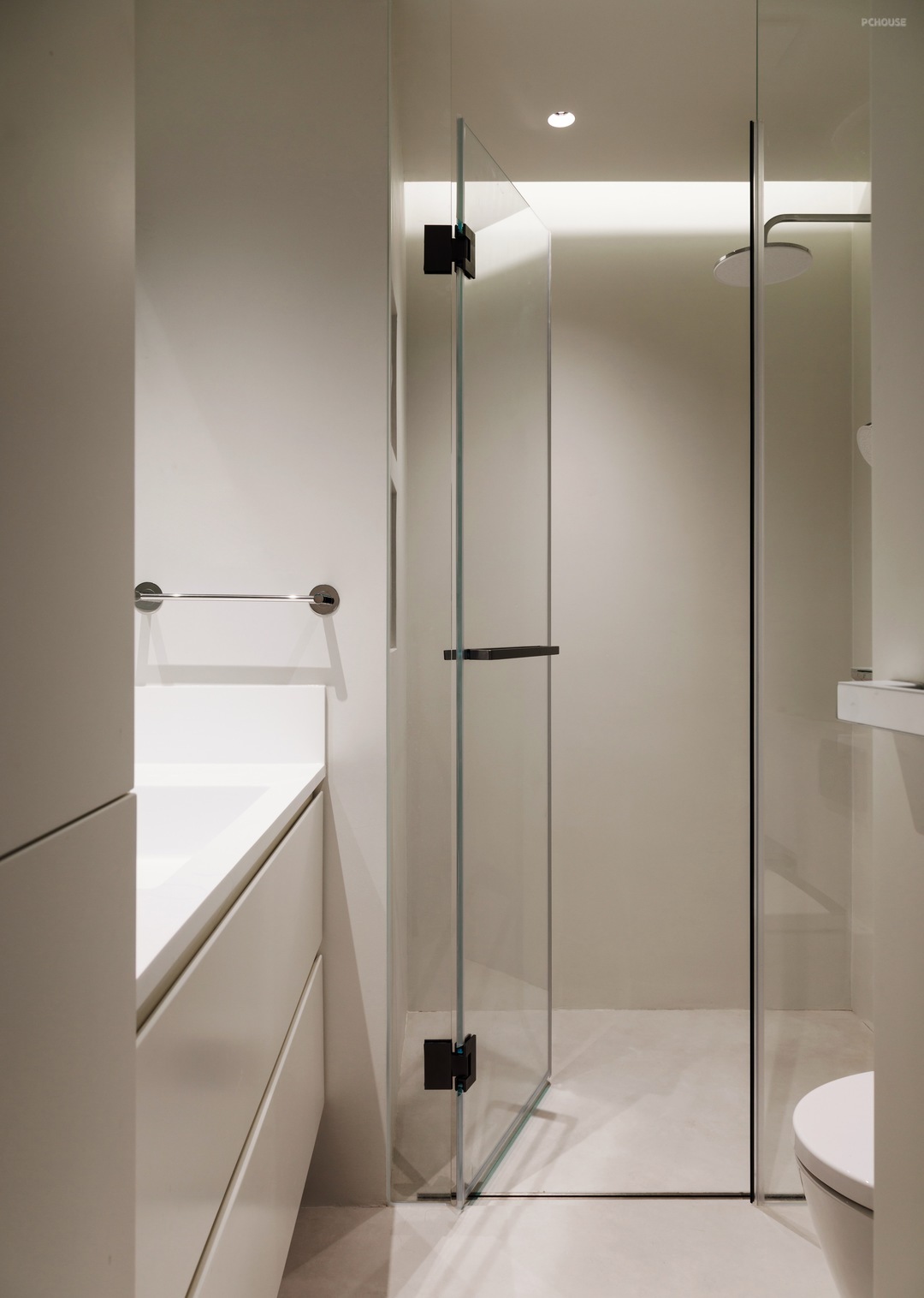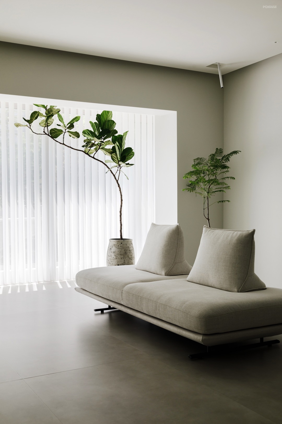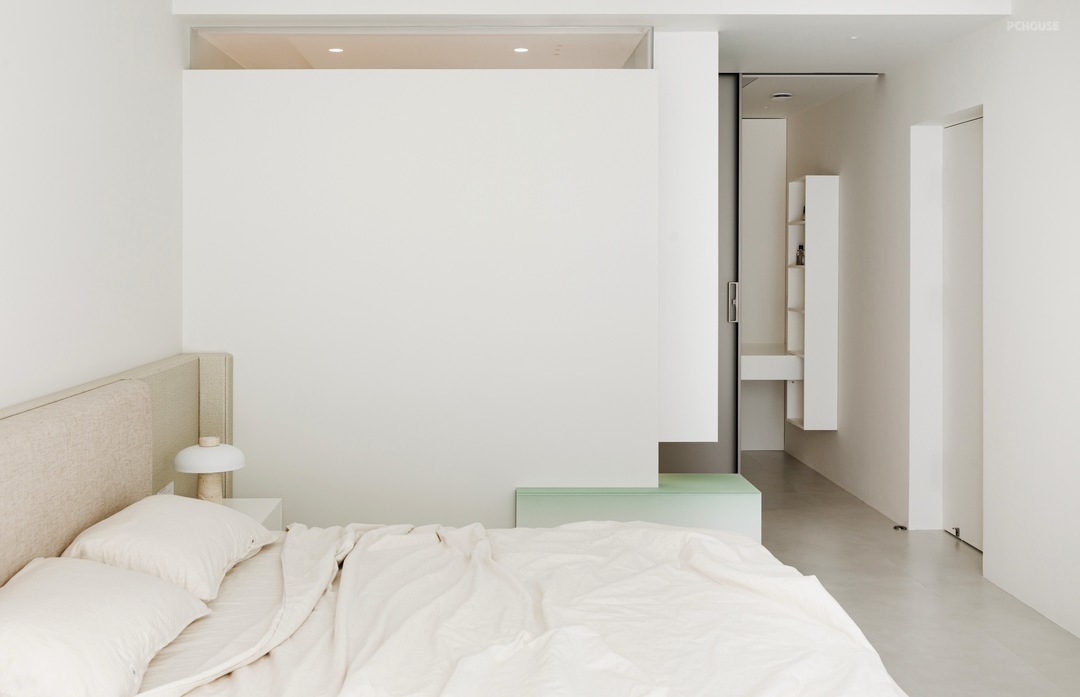 -整个墙面以及顶面都采用微水泥材质,用最真实的纹理和质感,传递着自然本真,配合无踢脚线式设计,视觉上增加层高,地面和墙面的衔接也更为利落。