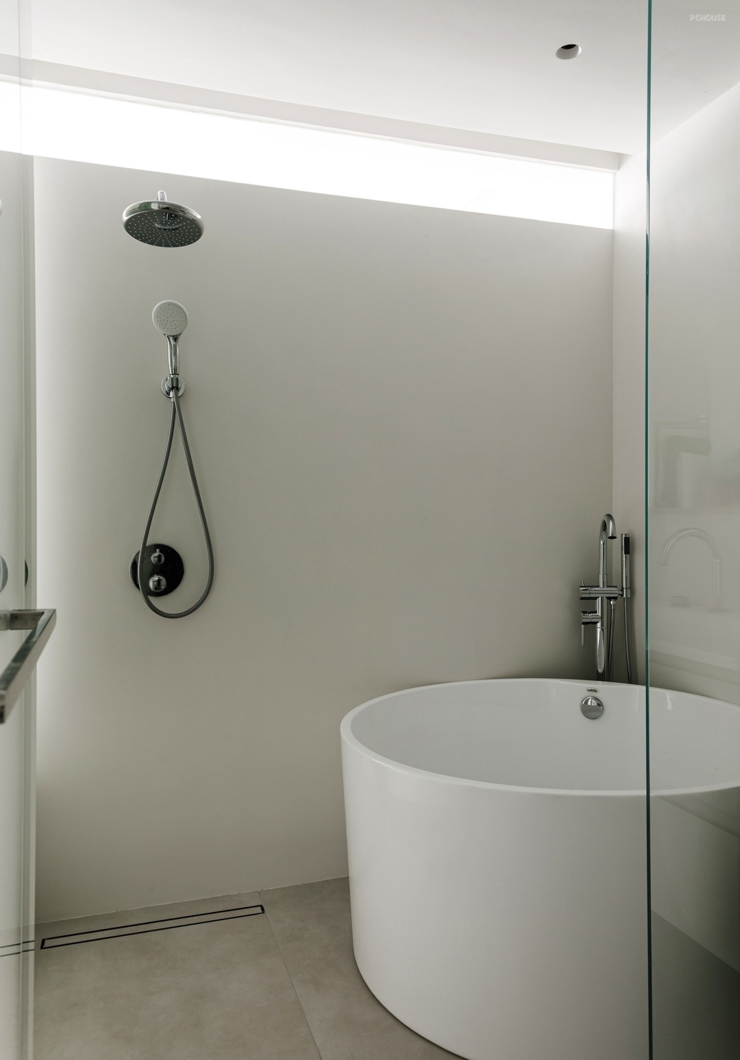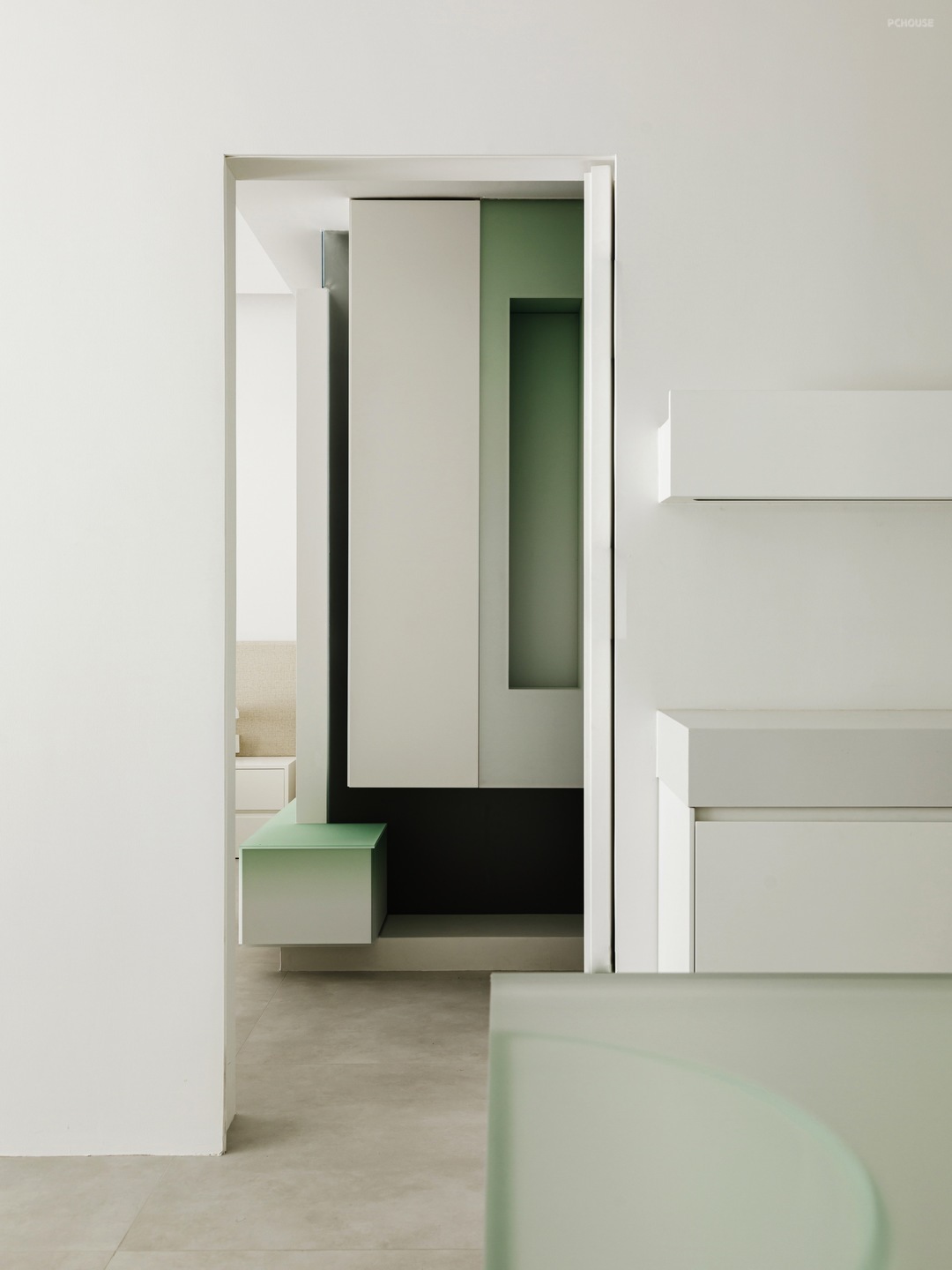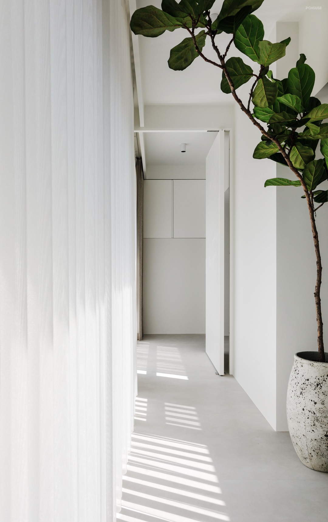 -整个墙面以及顶面都采用微水泥材质,用最真实的纹理和质感,传递着自然本真,配合无踢脚线式设计,视觉上增加层高,地面和墙面的衔接也更为利落。