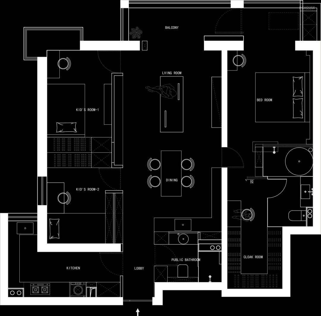 -梳理动线,调节公私区互动 通过洄游动线,总能创造更大的活动空间,休闲时刻是屋主与家人互动最重要的时间,因此规划开放式空间,利用洄游动线串联客厅、餐厅与西厨区,削弱了公私领域的界定,也促进了亲子互动。