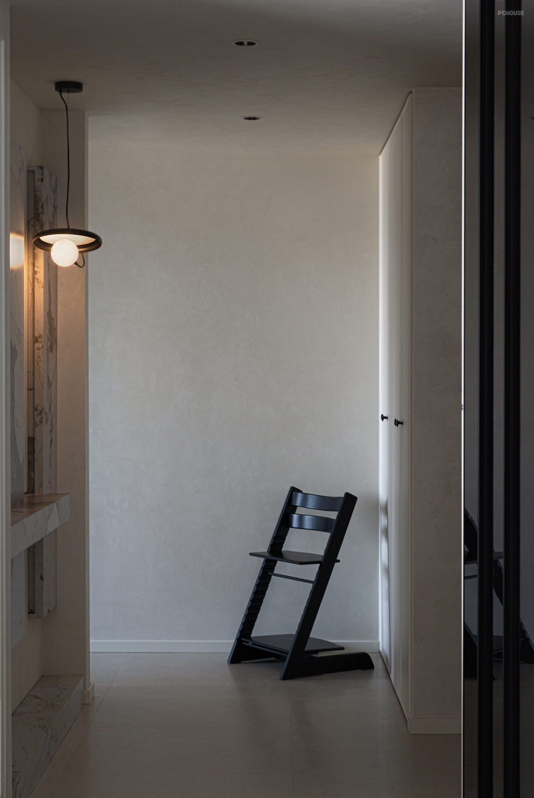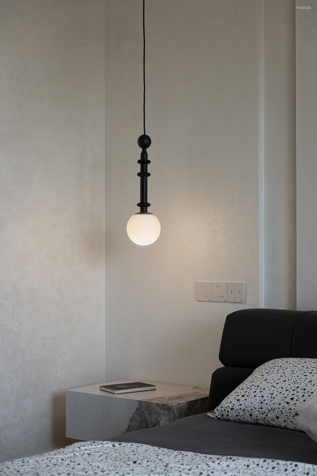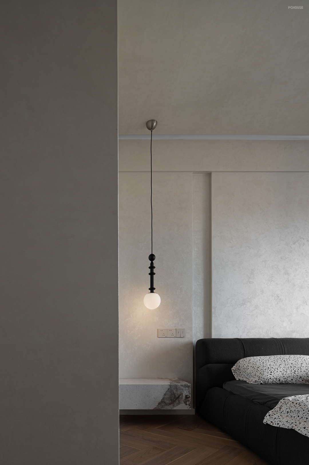 大理石床头台面延续空间极简格调,纹理自然流淌;一盏小吊灯垂落,以柔和光晕点睛,在静谧中勾勒出雅致的休憩氛围。