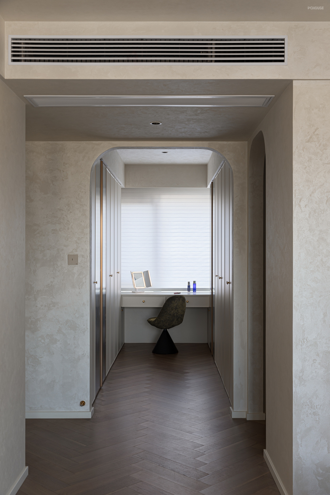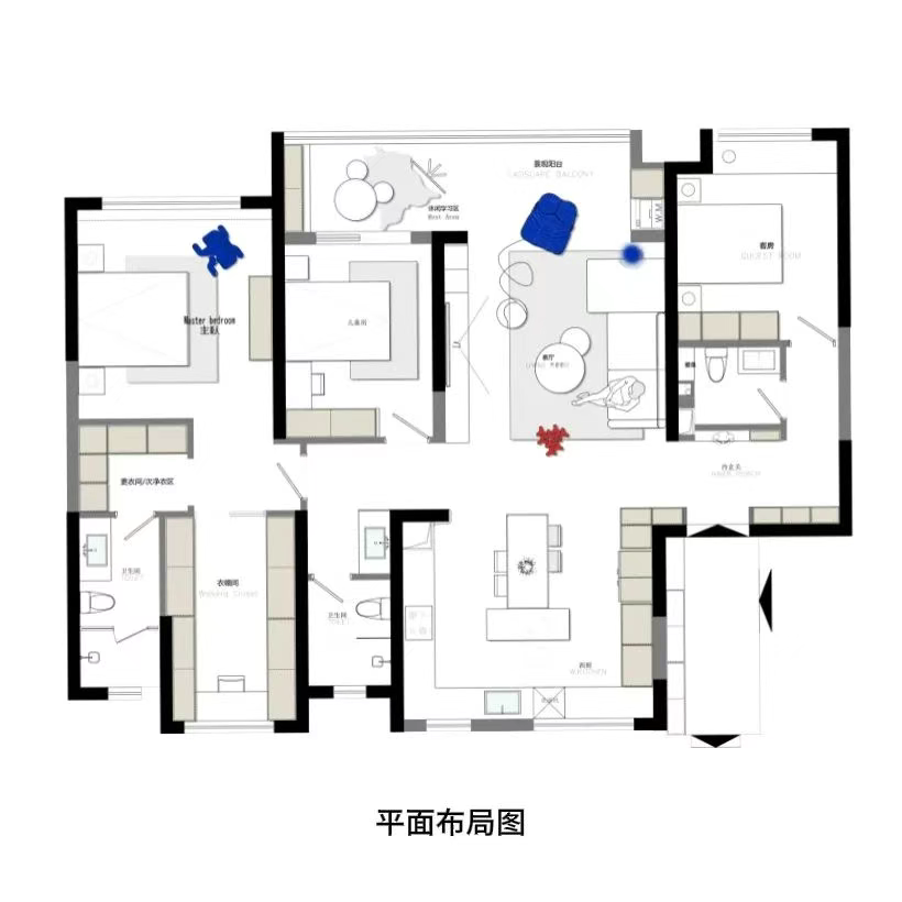 这场设计的缘起,恰是对 “反差” 的温柔捕捉。我们以法式的柔意为底,勾勒石膏线的细腻弧度,让阳光透过百叶窗时,在地面投下慵懒的光斑;又以现代极简为骨,用利落的线条划分功能区,隐藏式储物柜收纳奖杯与球鞋,让空间始终保持呼吸感。在每次房门的开合之间,讲述着一段关于精致与永恒的故事....
