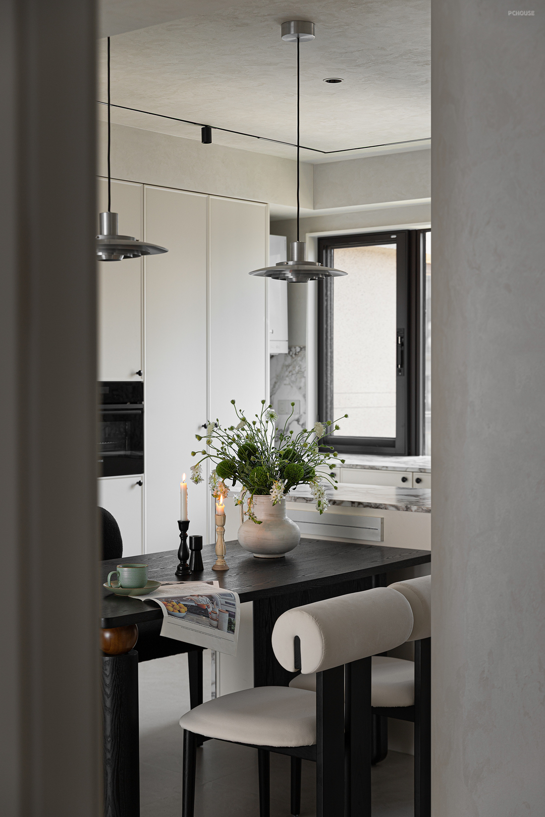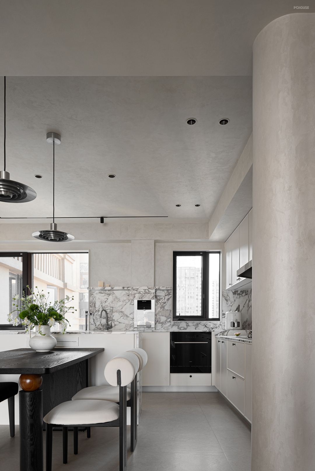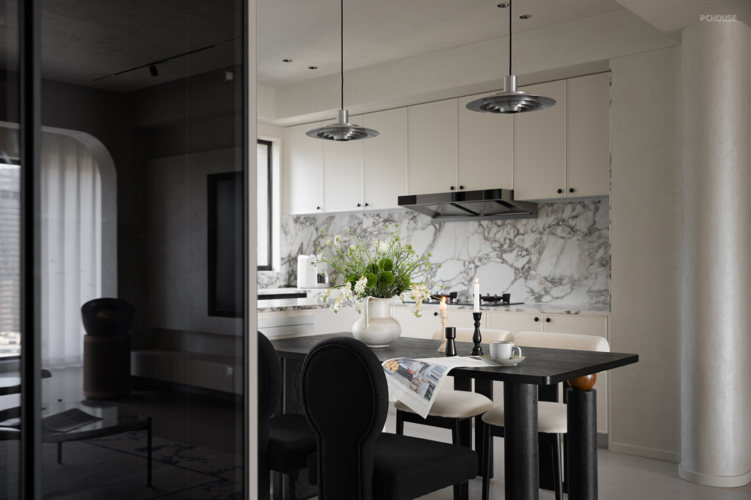 金属吊灯垂落,冷冽光泽与石材温润相映成趣。开放式设计消弭空间界限,让烹饪时光充满互动,烟火气里藏着诗意