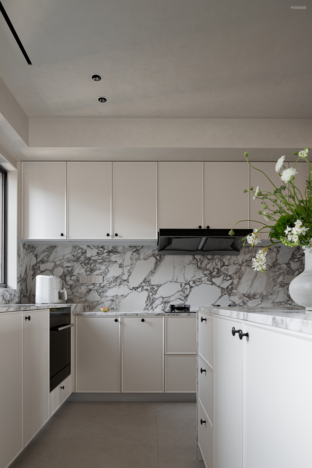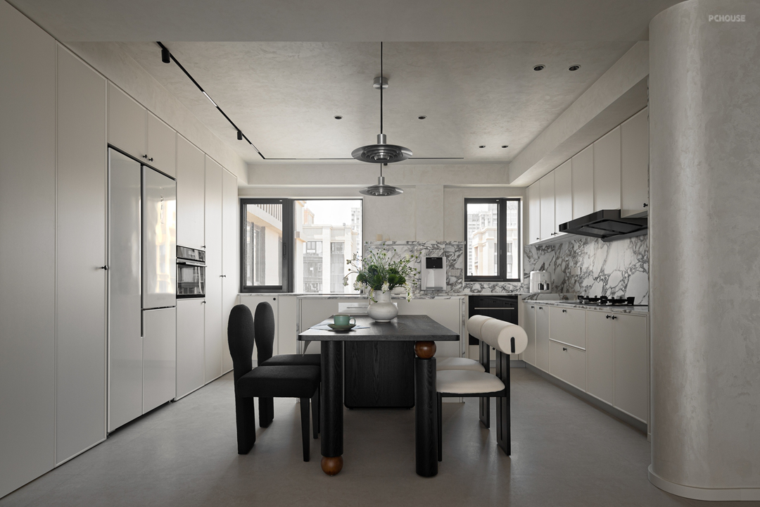 厨房成为艺术与生活的交融之所。天然石材背景墙带着岁月雕琢的纹理,将自然的深邃纳入方寸之间。
