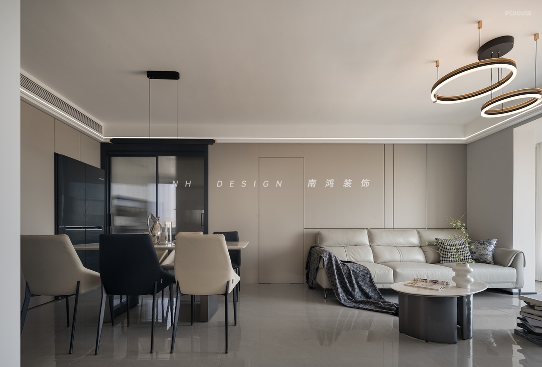 与餐厅、阳台的一体开放,客厅收获了更大的空间感。背景面透过统一的色调与隐形门的方式,形成视觉上的完整延展,线条对块面适度的切割划分,为空间带来有秩序的层次感。