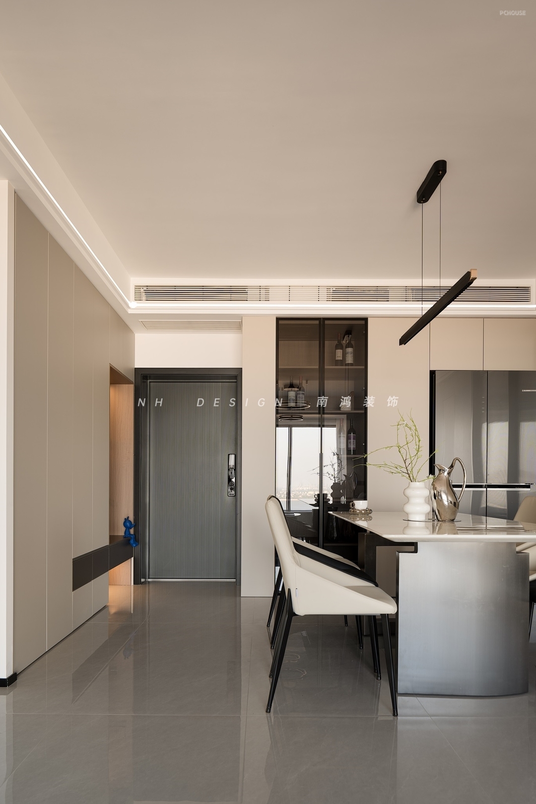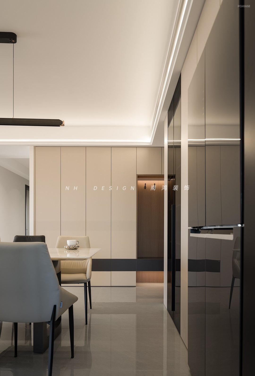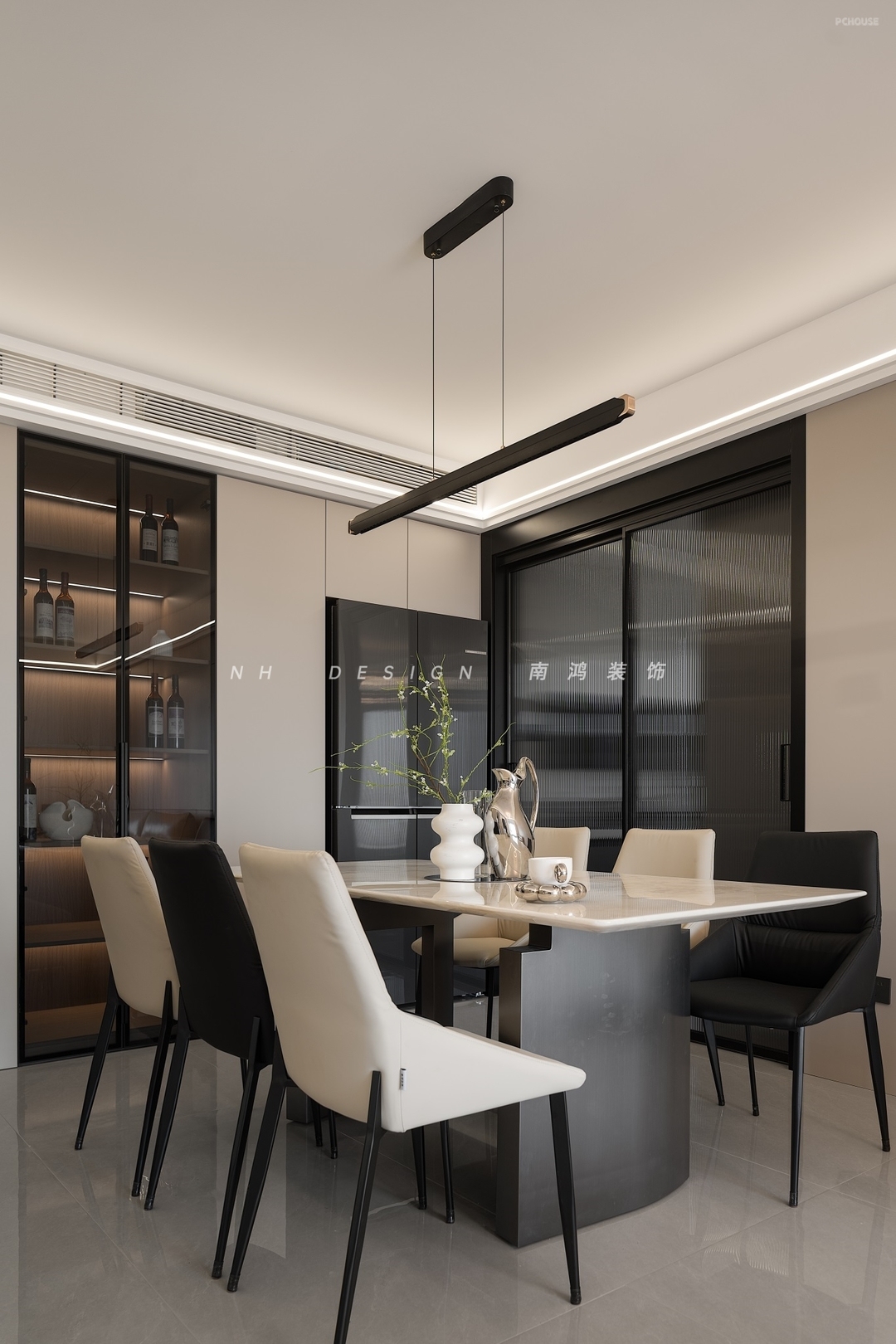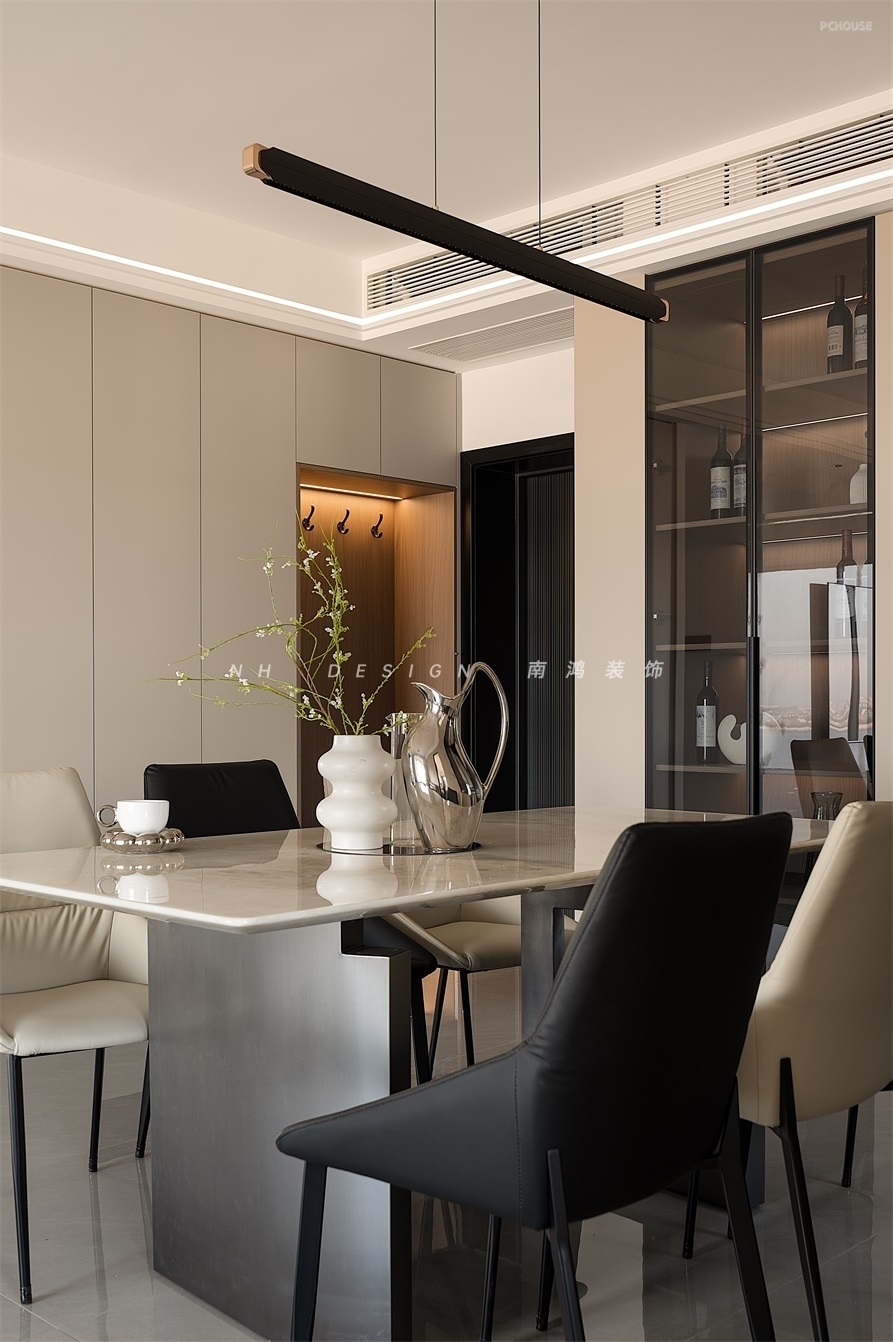 餐厨动线紧密并通过玻璃移门相隔,冰箱外置,节省了厨房的空间。轻奢感石材餐桌搭配米色与黑色组合的餐椅,沉稳中显出高级质地,玻璃柜的加入也为空间增添了更多通透感。