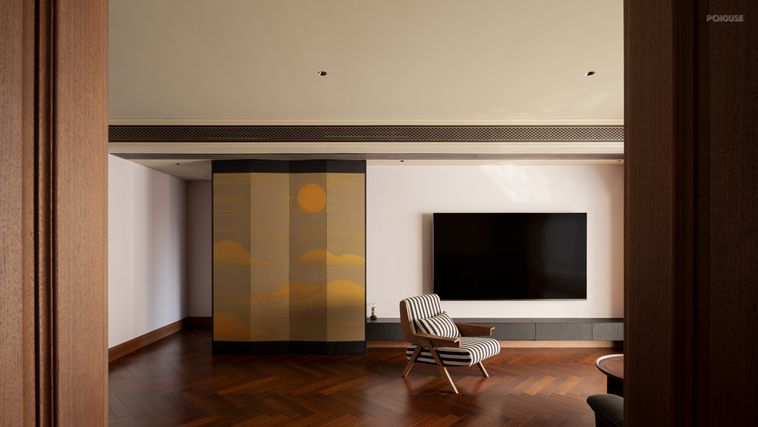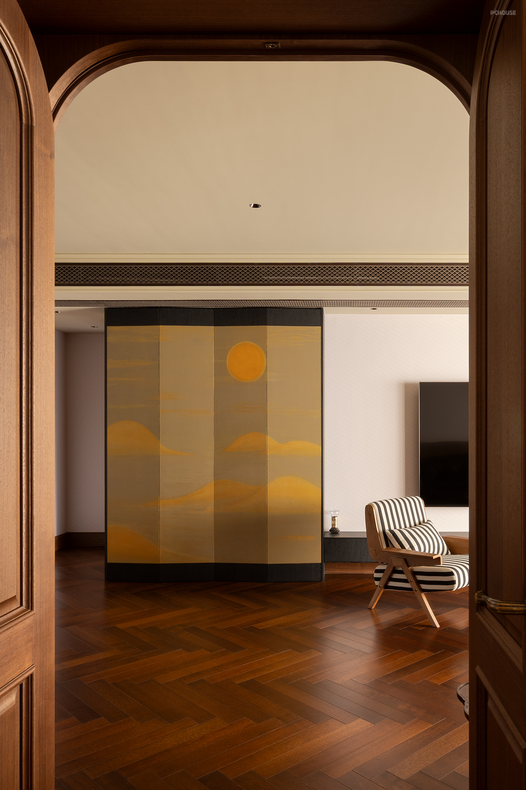 招待着所有来客视线,也是客厅最吸睛的,便是这组金箔漆手绘壁画。进门后,从客厅,餐厅望去,壁画上的云朵浓淡不一,趣味十足。实际上,它是这组书柜的柜门,顶部的中央空调风口也定制了纹路造型,电视的插座线路等统统藏在悬浮柜抽屉后……屏蔽日常琐碎,尽情享受复古东方的华丽舒适感。