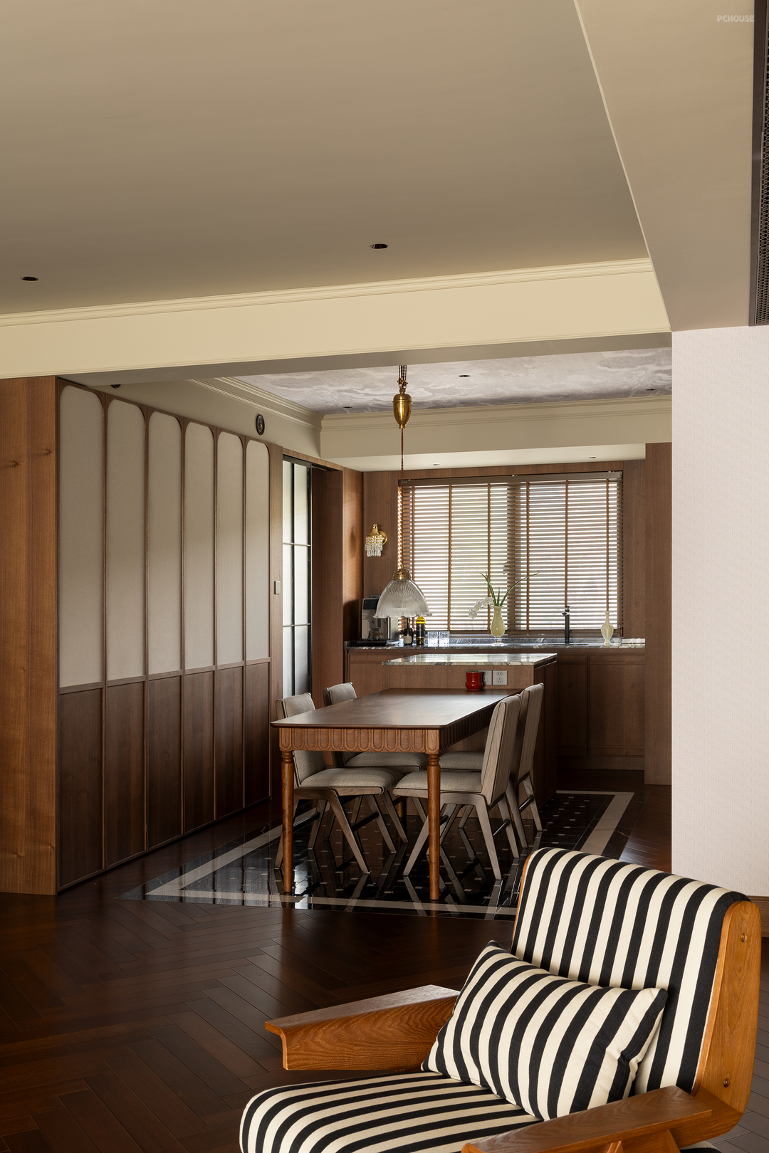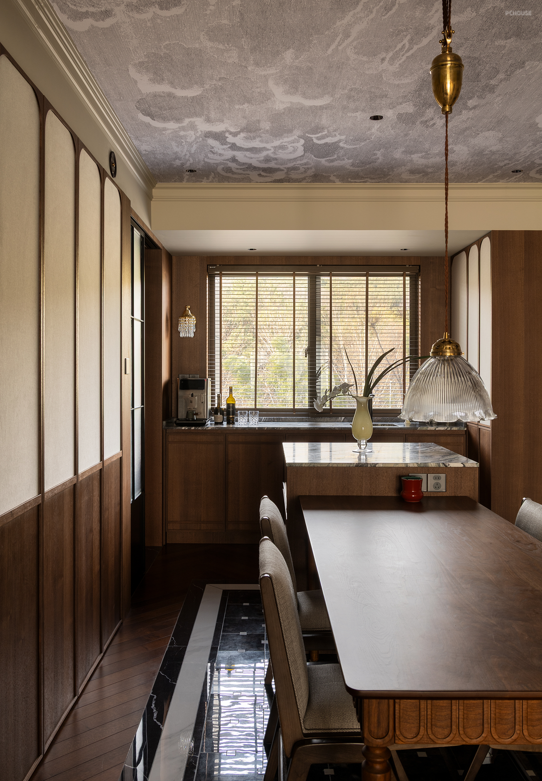 岛台餐桌底部用深蓝色岩板裁切成很小的比例铺贴,结合石材波打线做成类似地毯的效果围绕着餐厅,自然而然凸显出空间焦点。顶部则用流动感很强的云纹壁布,深深浅浅的云纹涌向北面的窗户,与窗外的公园有一种自然上的连接感。