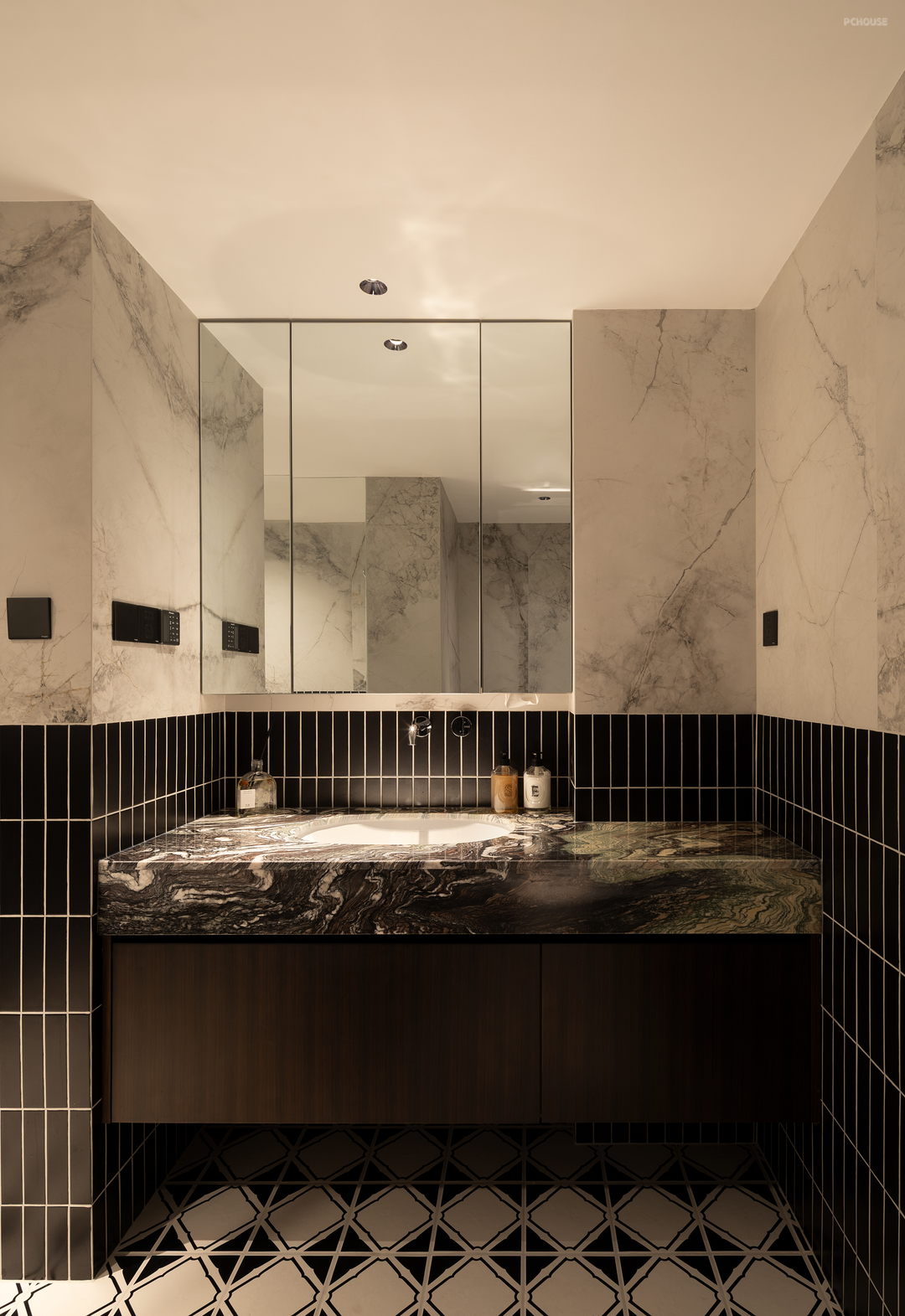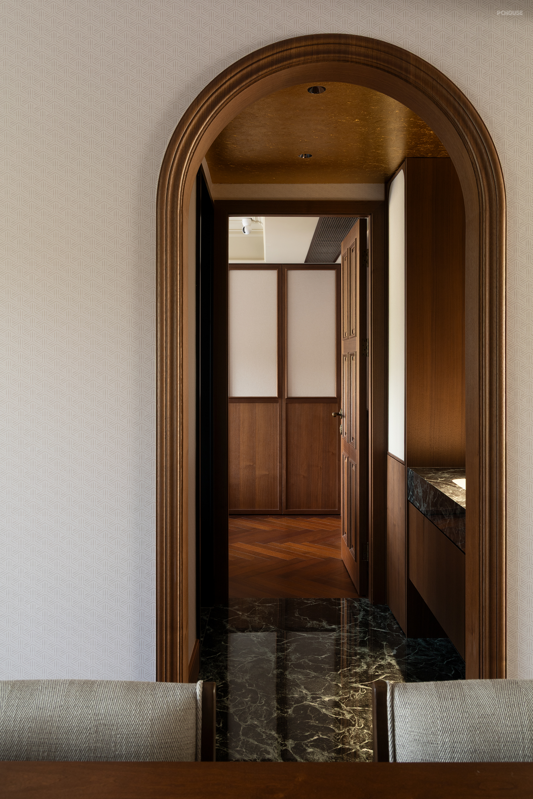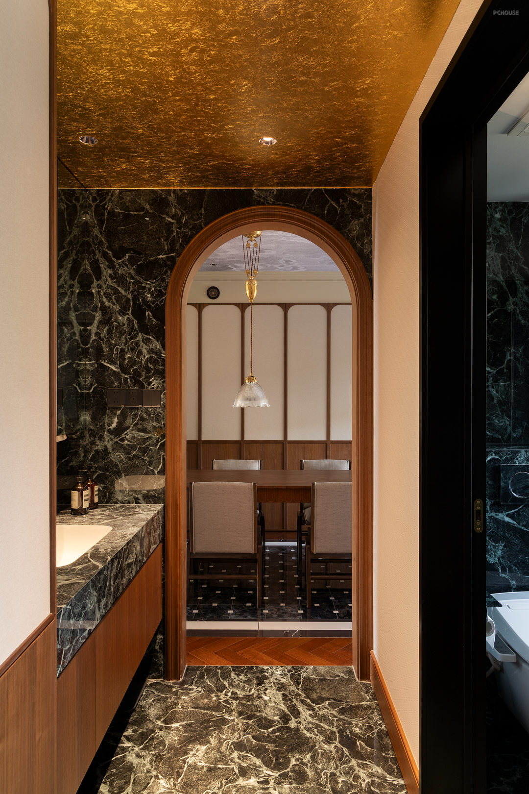 从餐厅到北次卧需经过客卫,我们将干区外移,拱形门洞,顶部铺设的手工锤纹金箔与墙壁、地面的深绿色普拉达岩板形成大胆的对冲色。当过道不可避免,便把它转变成一个展示个性的舞台,为屋主们的日常使用增添趣味。