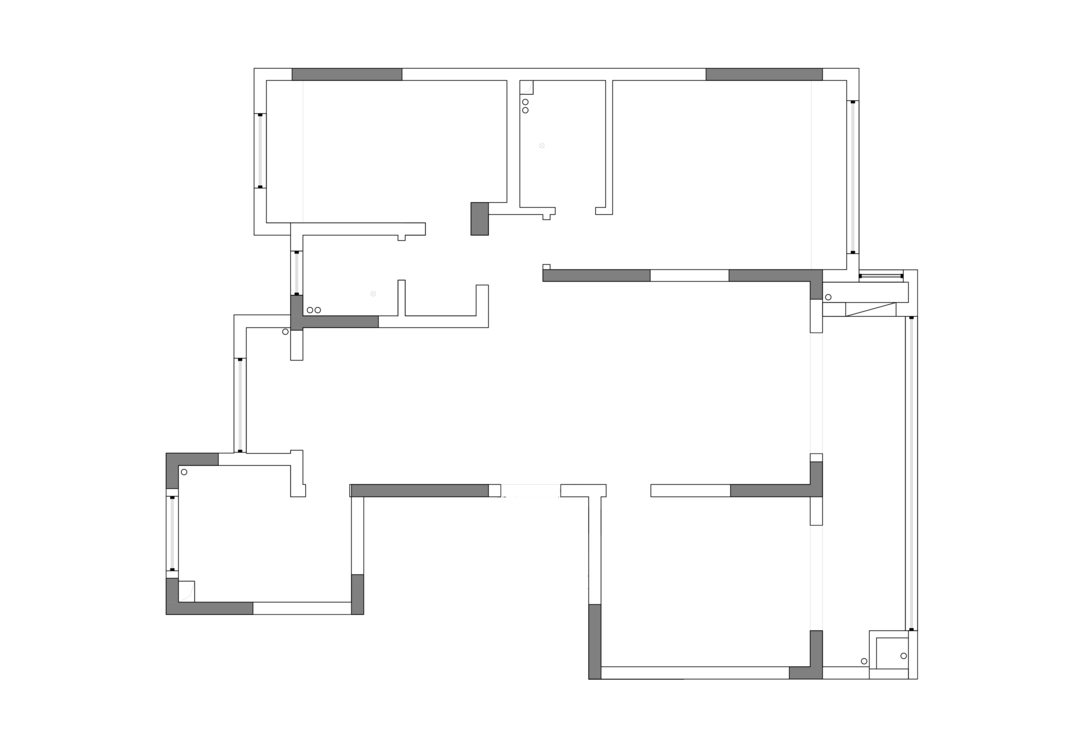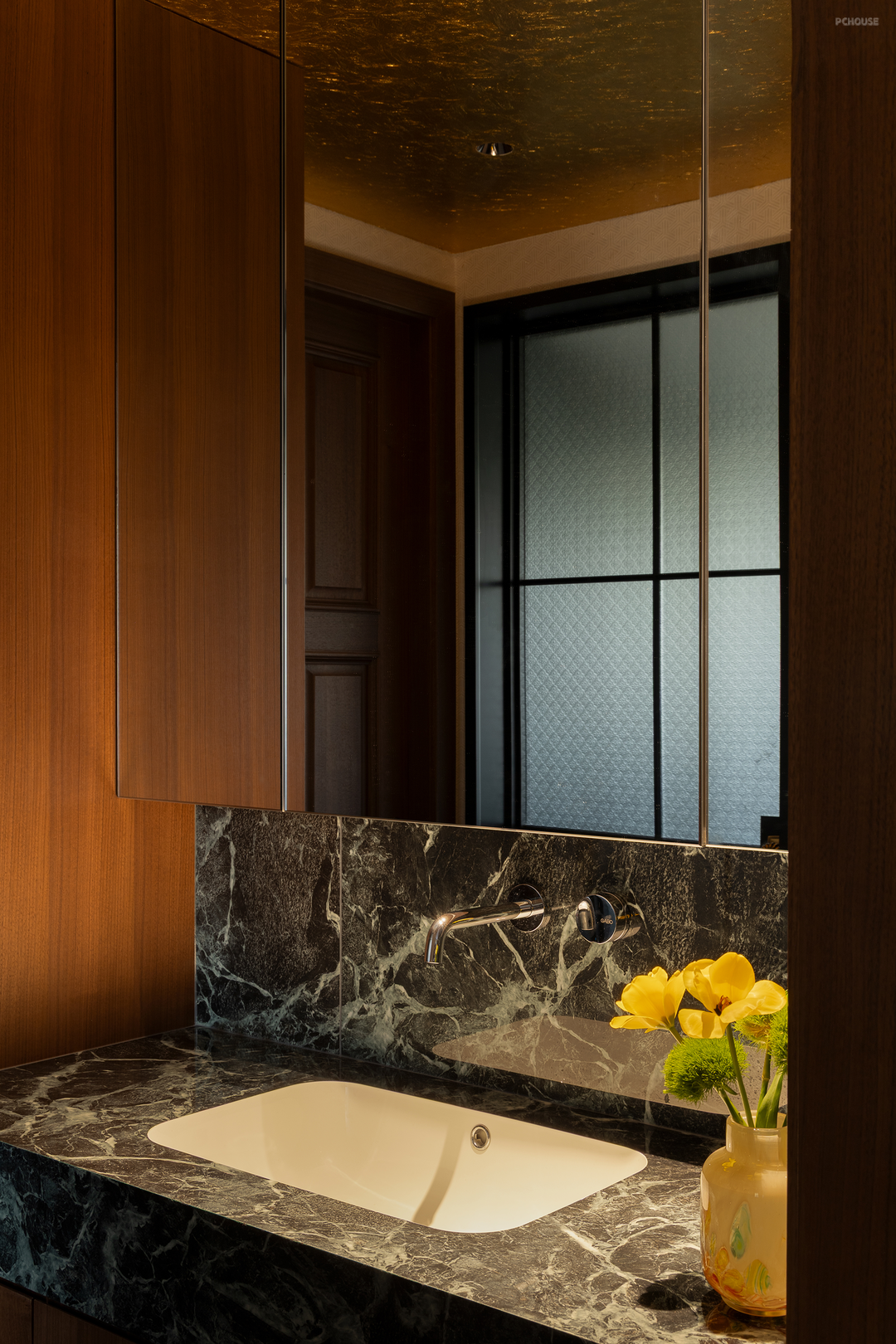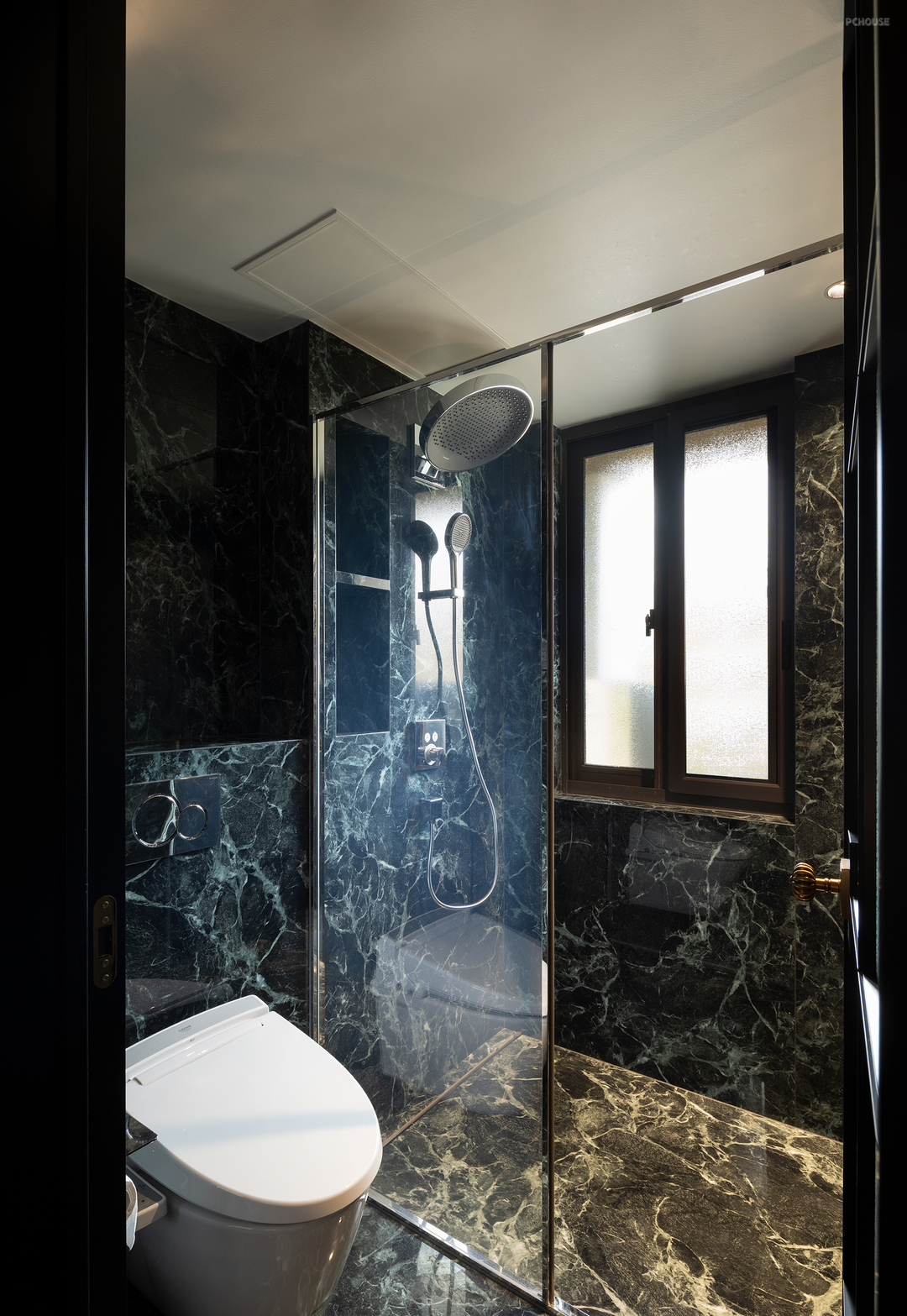 从餐厅到北次卧需经过客卫,我们将干区外移,拱形门洞,顶部铺设的手工锤纹金箔与墙壁、地面的深绿色普拉达岩板形成大胆的对冲色。当过道不可避免,便把它转变成一个展示个性的舞台,为屋主们的日常使用增添趣味。
