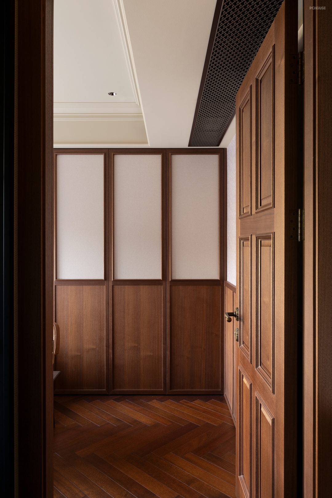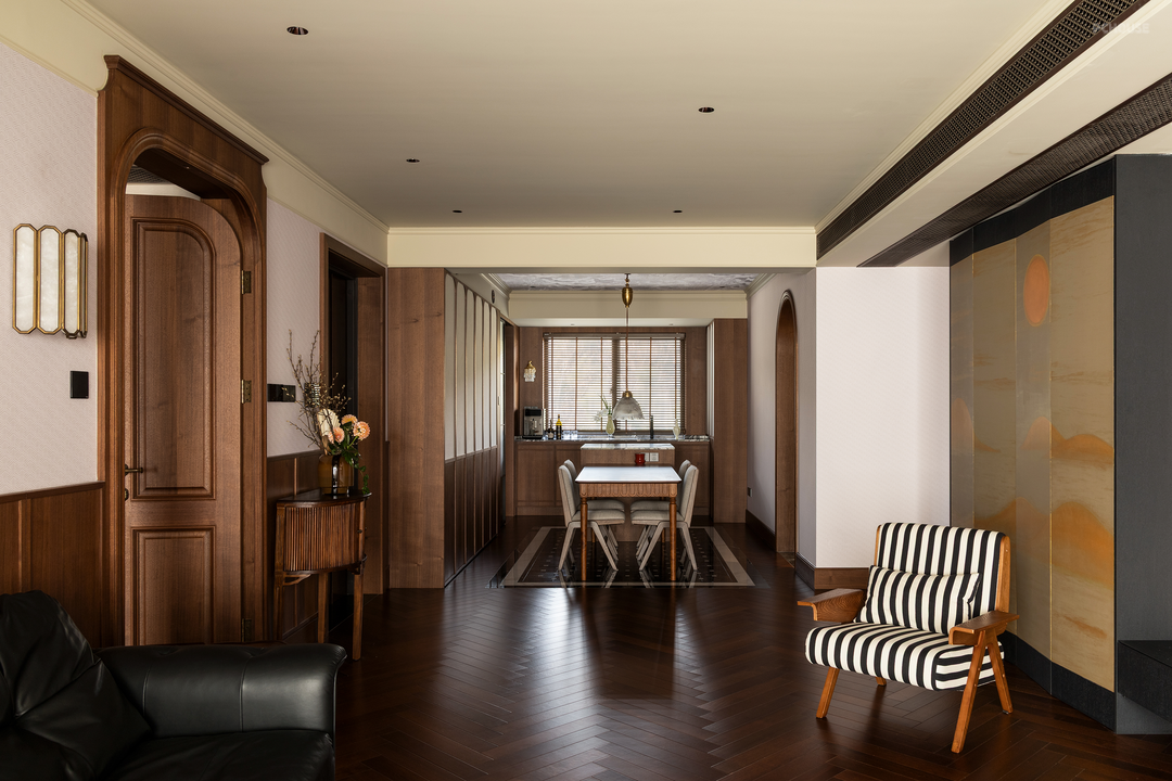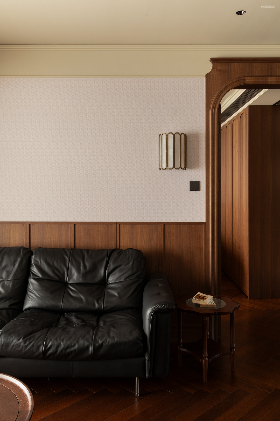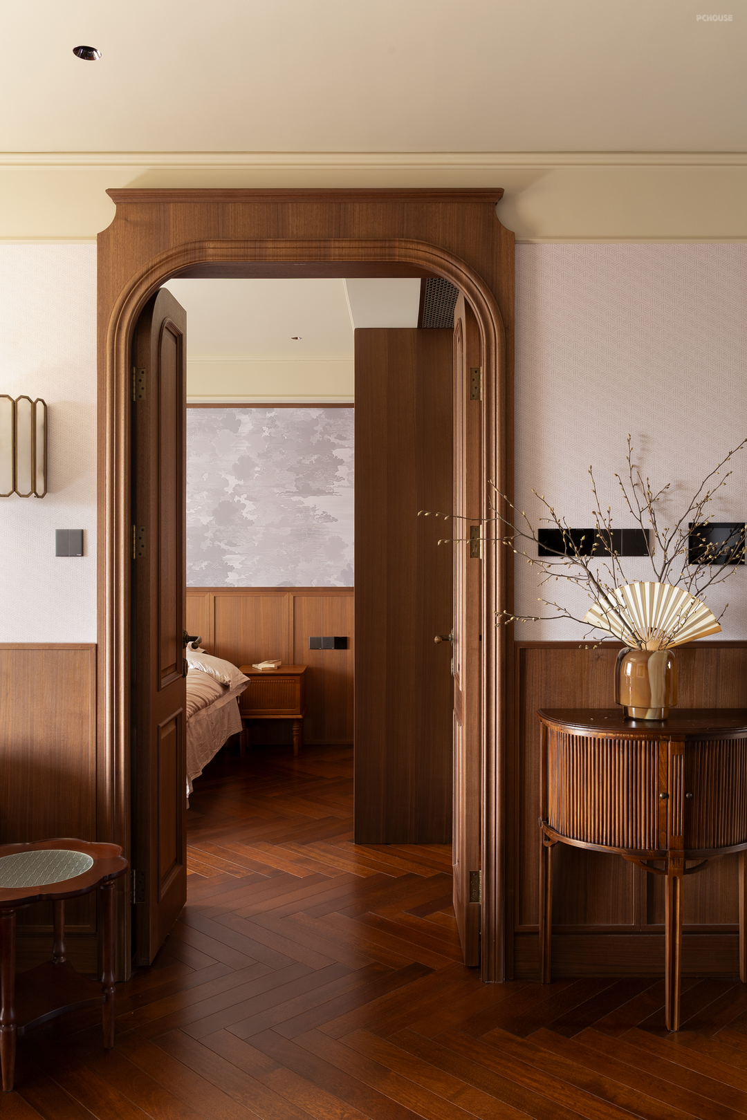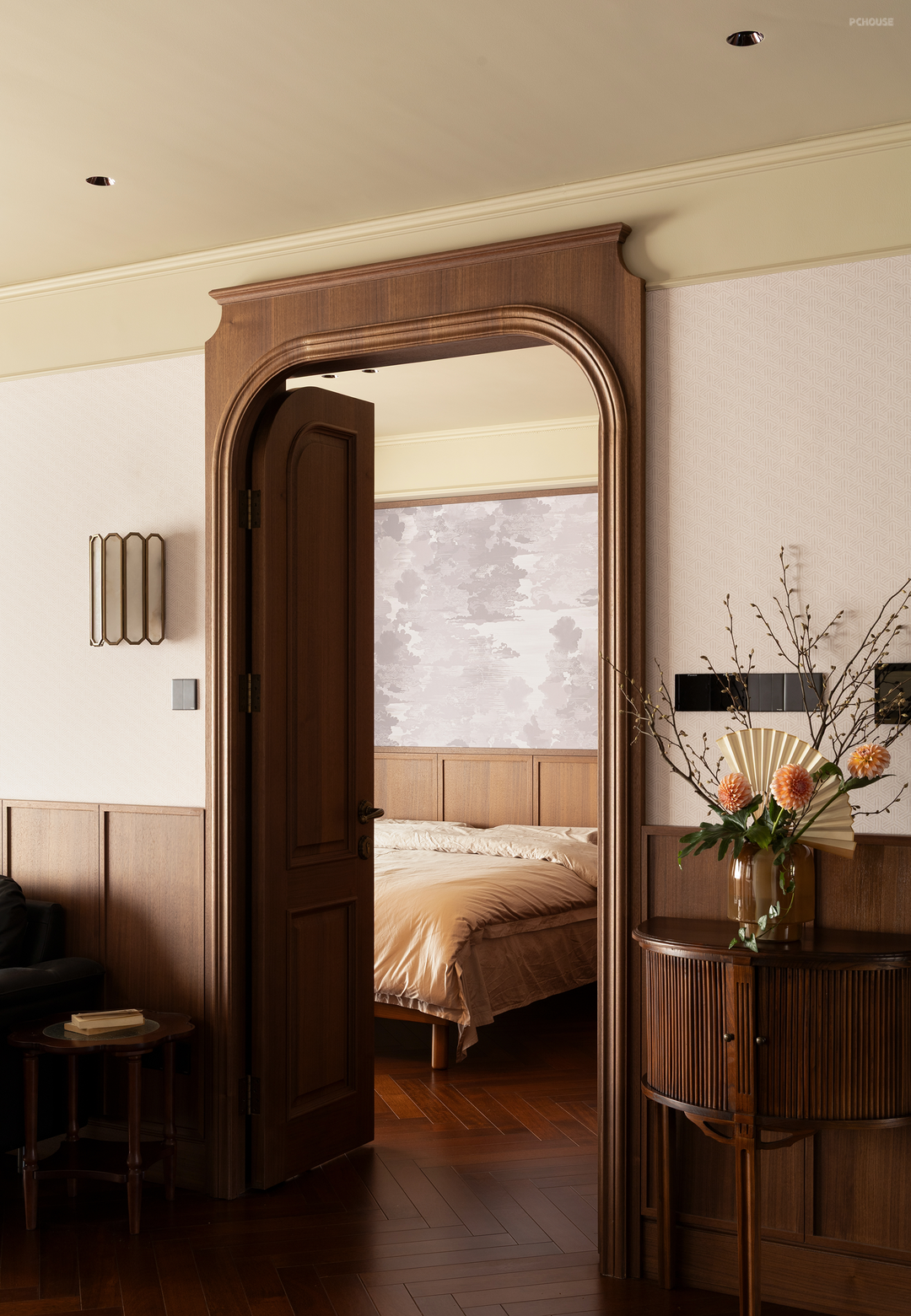 壁纸搭配木质半墙是海派、复古等常见的手法。不过这里我们用了定制的太阳锁子纹壁纸,寓意“安全、团结、防护和祝福”,馥郁的木质调在不同的空间中呼应。云石壁灯、实木半圆柜,定制的次卧双开门门套,让空间层次丰富起来。