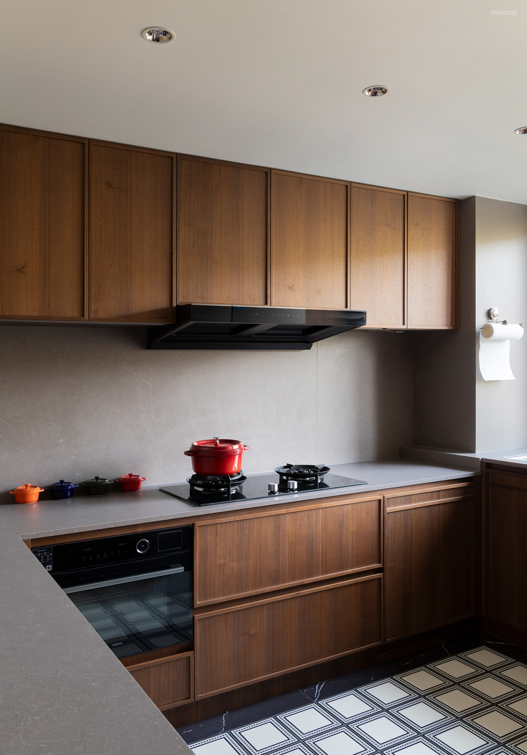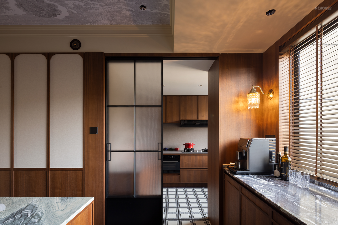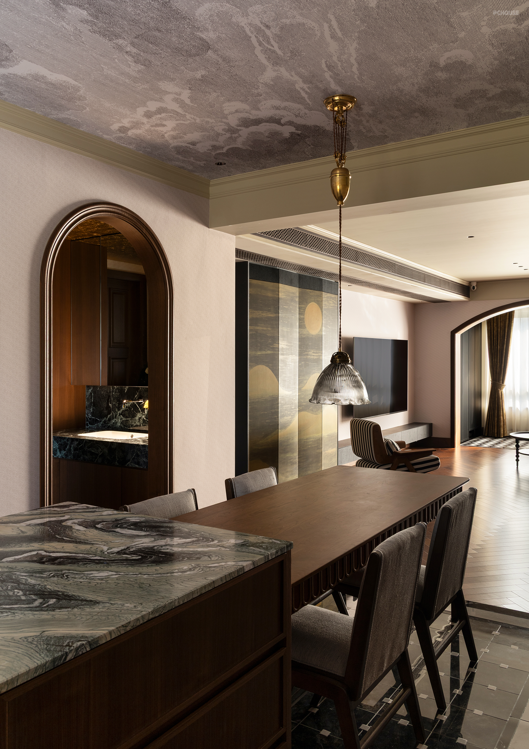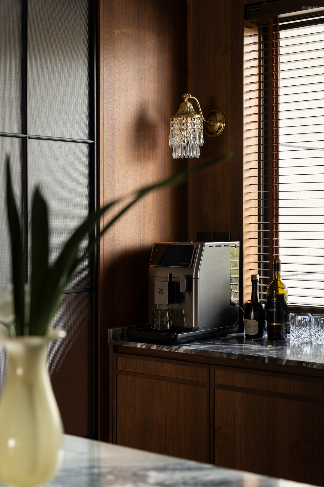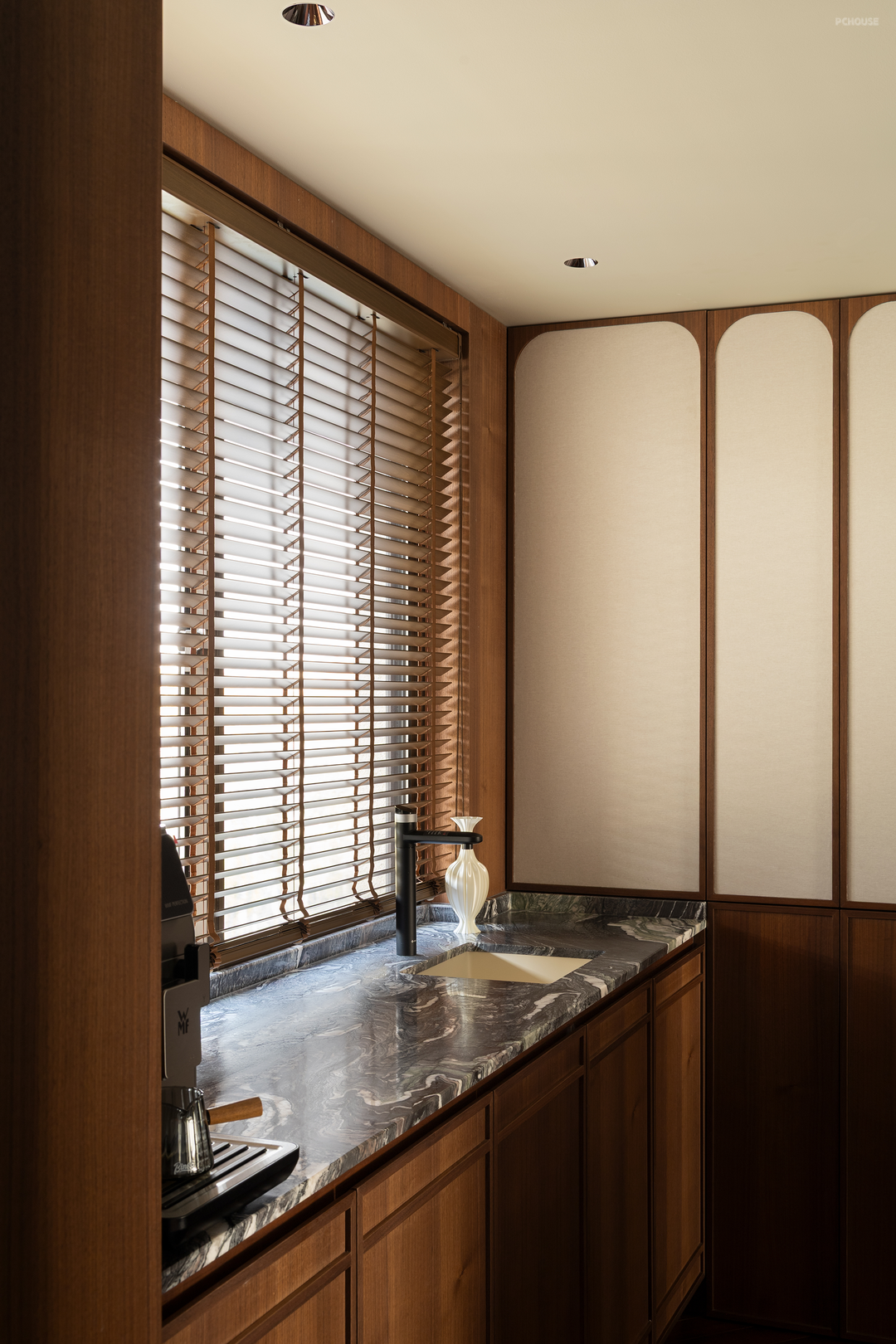 中岛与水吧台使用紫山水大理石做台面,这种石材基调为深紫色,穿插着白色与清透的绿色,脉络如河川,有东方水墨画的感觉。中岛选用较浅的一块,水吧台则用深色,色彩递进中划分出空间层次感。