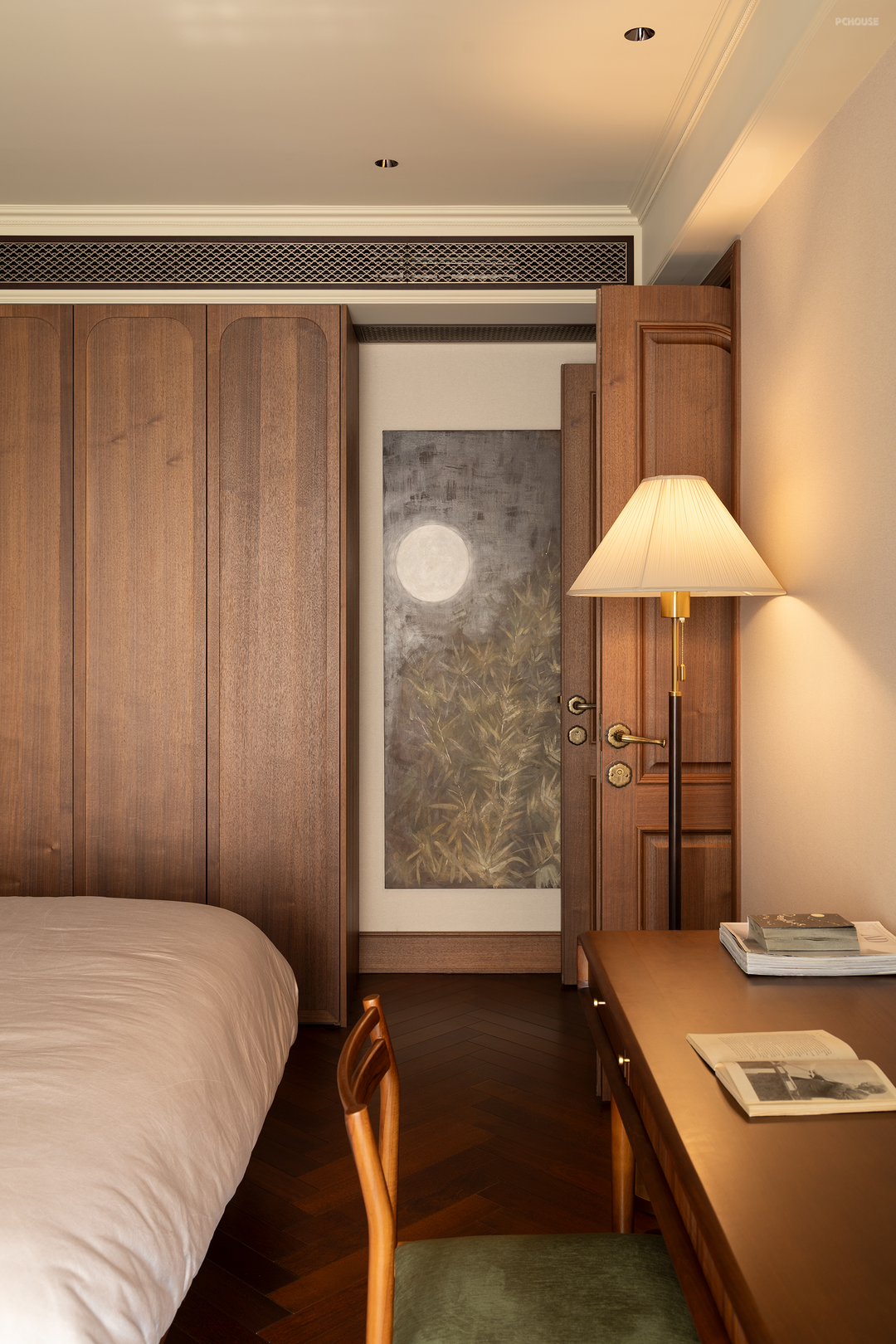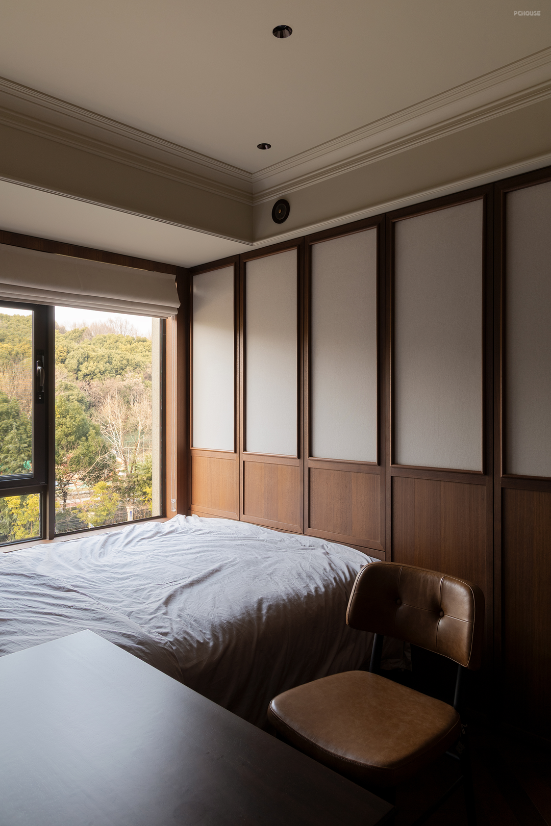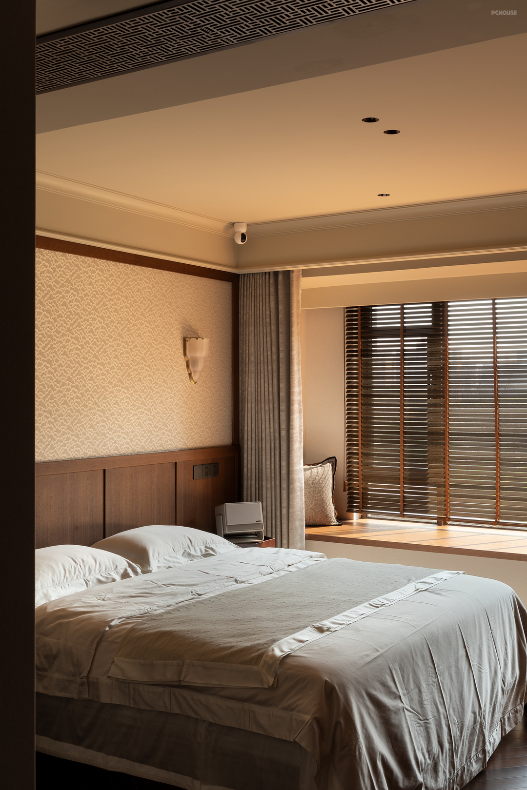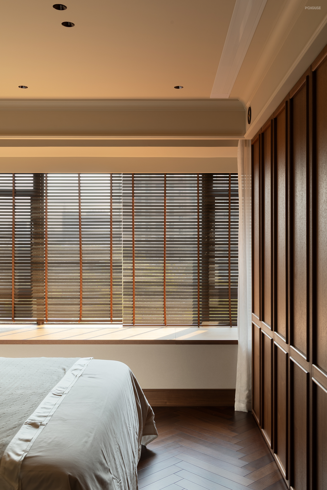床尾储物柜、飘窗与百叶都使用了带来馥郁沉厚感的木质,在不同光线下,木质细腻的纹路产生轻柔的包裹感,营造舒适的睡眠空间。