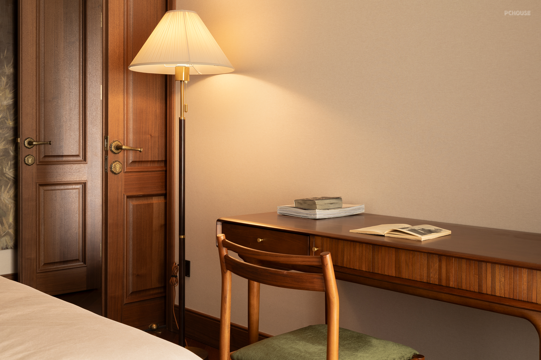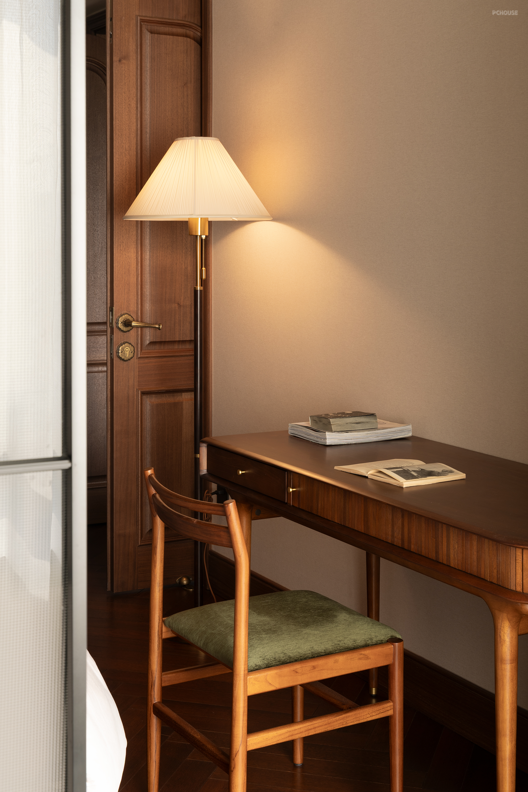 床尾摆放了一张黄杨木书桌,造型简约但有风琴柜门这种有趣的细节,搭配落地灯,软装搭配不贪多,几件质感单品就可以营造一个氛围感满满的阅读区。
