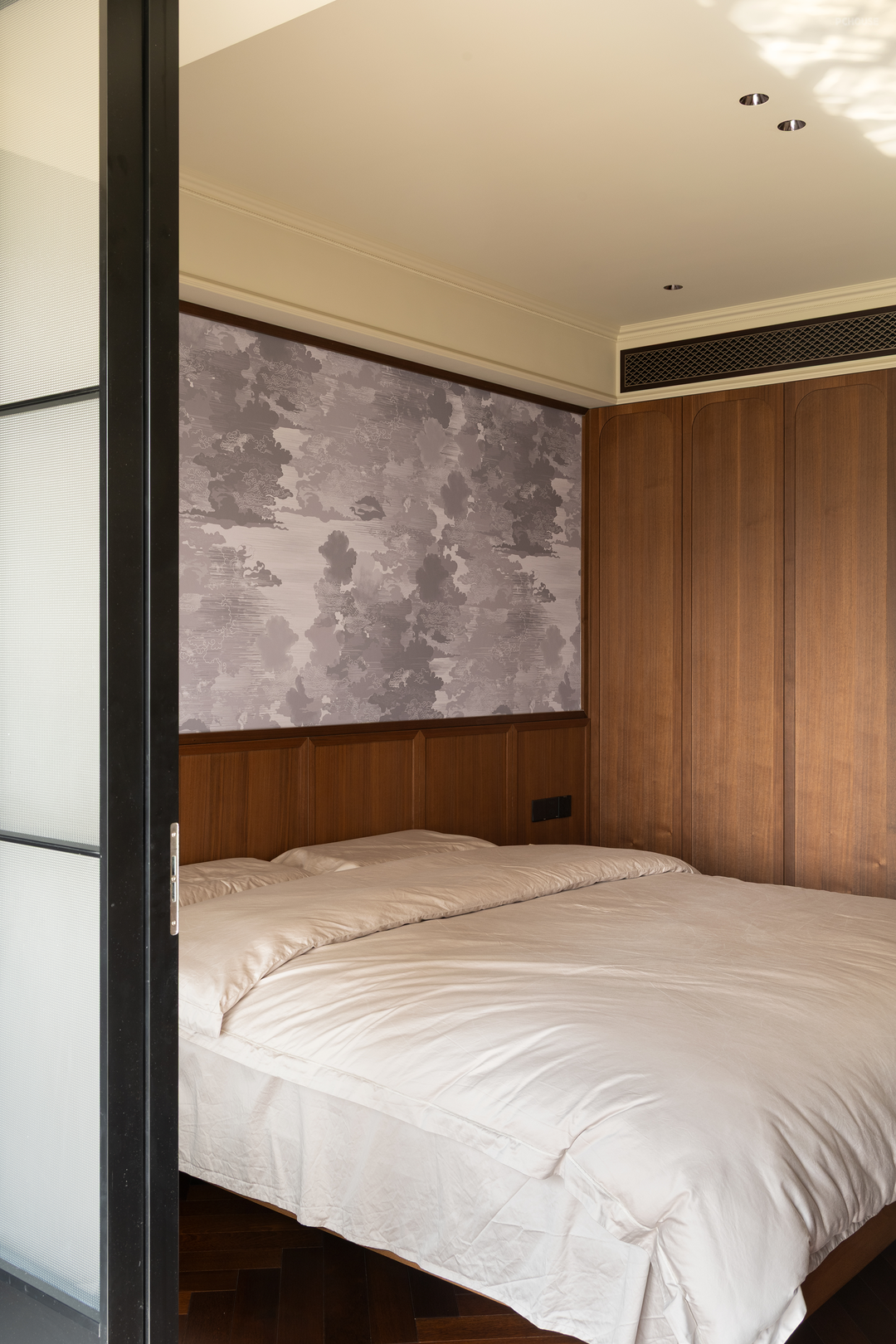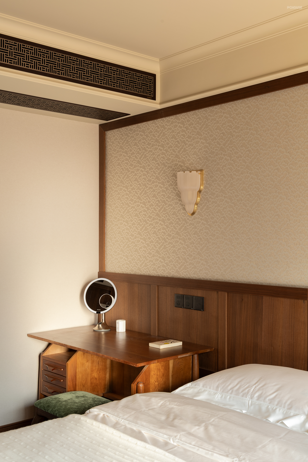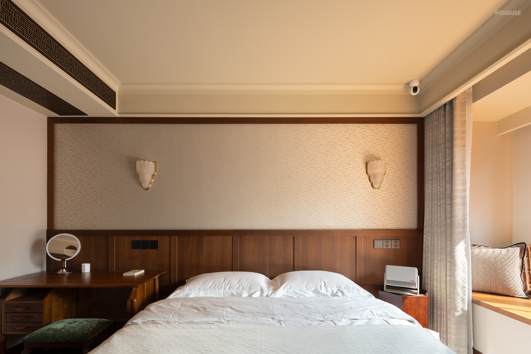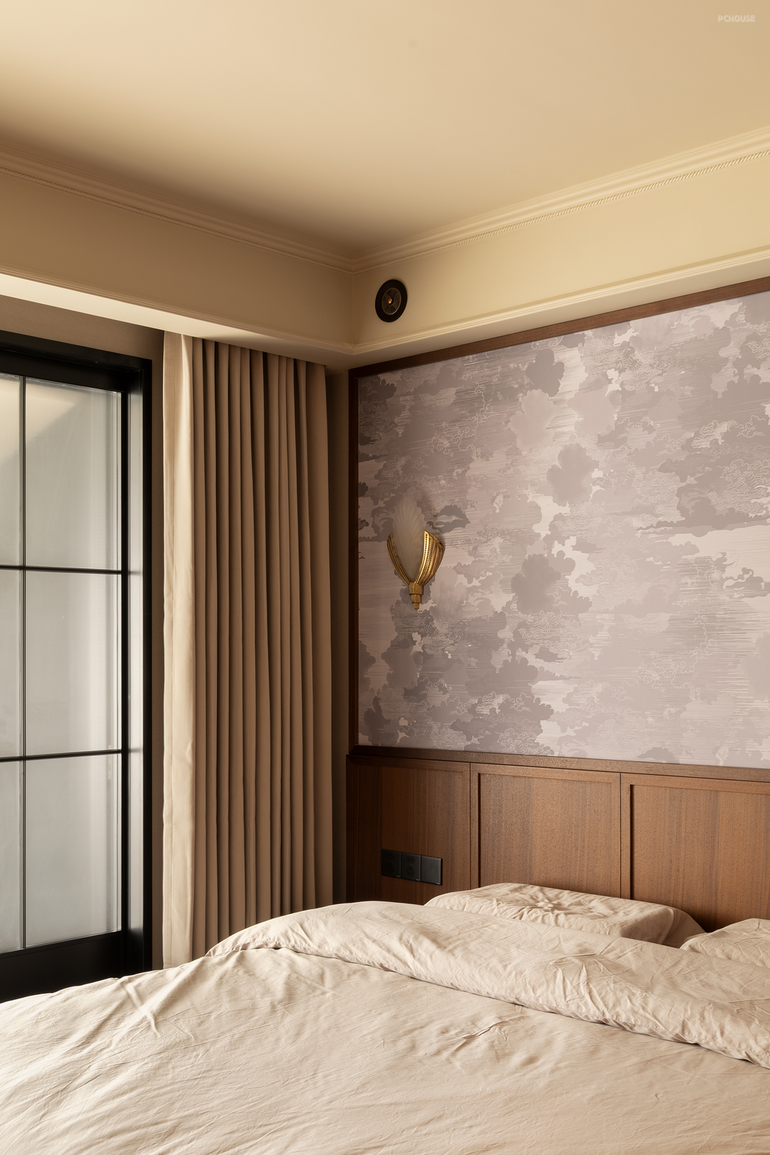 主卧在空间布局上改动较大,比如我们调整主卫入口,避免主卫门正对床。床头背景采用壁纸搭配木质半墙的做法,这里壁纸同样为定制的中式传统纹路,在阳光下折射出浅浅的金色光泽,与ArtDeco风的壁灯,营造卧室的华丽复古氛围。