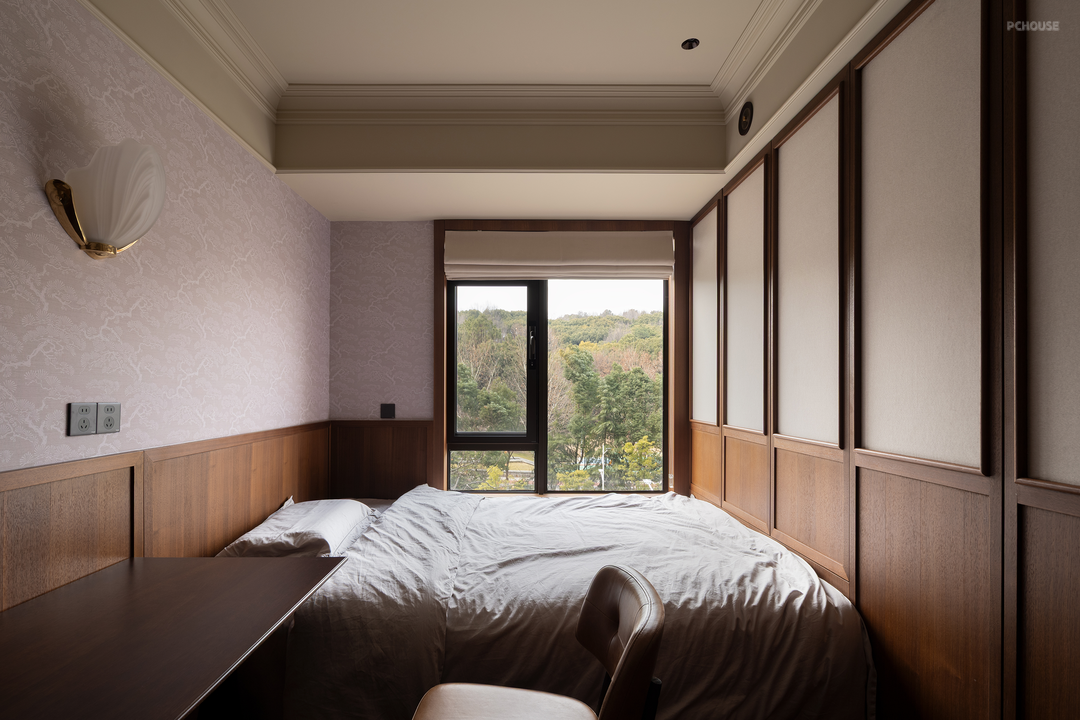 床头背景同样为壁纸与木质半墙的搭配,但考虑到卧室的氛围,我们没有大面积铺设,让柔和的浅米色渲染轻松宁静的氛围。