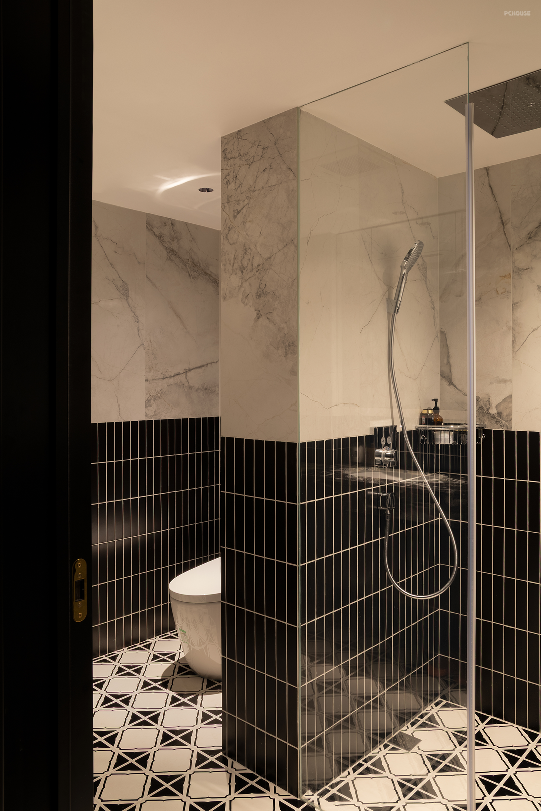 主卫用紫山水做台下盆,镜柜可以储存一些日常用品,也可以给电动牙刷充电。淋浴间用了内嵌式天幕花洒,提升淋浴舒适度。虽然是暗卫,我们用深浅两色瓷砖分区搭配灯光设计,让卫浴空间舒适通透。