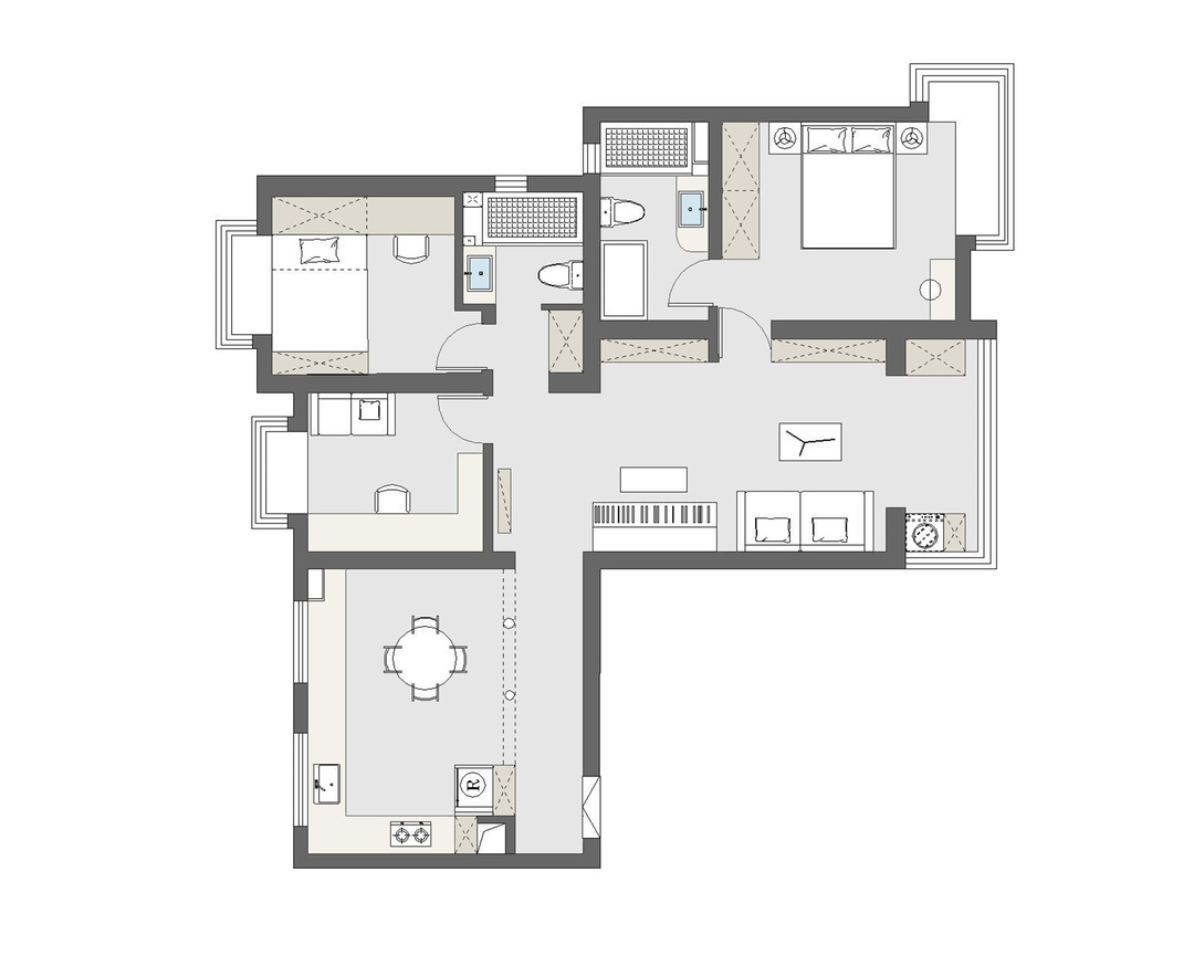对主卧房门的位置进行了改动,主卫空间得以释放,满足了屋主想要增设浴缸的需求。