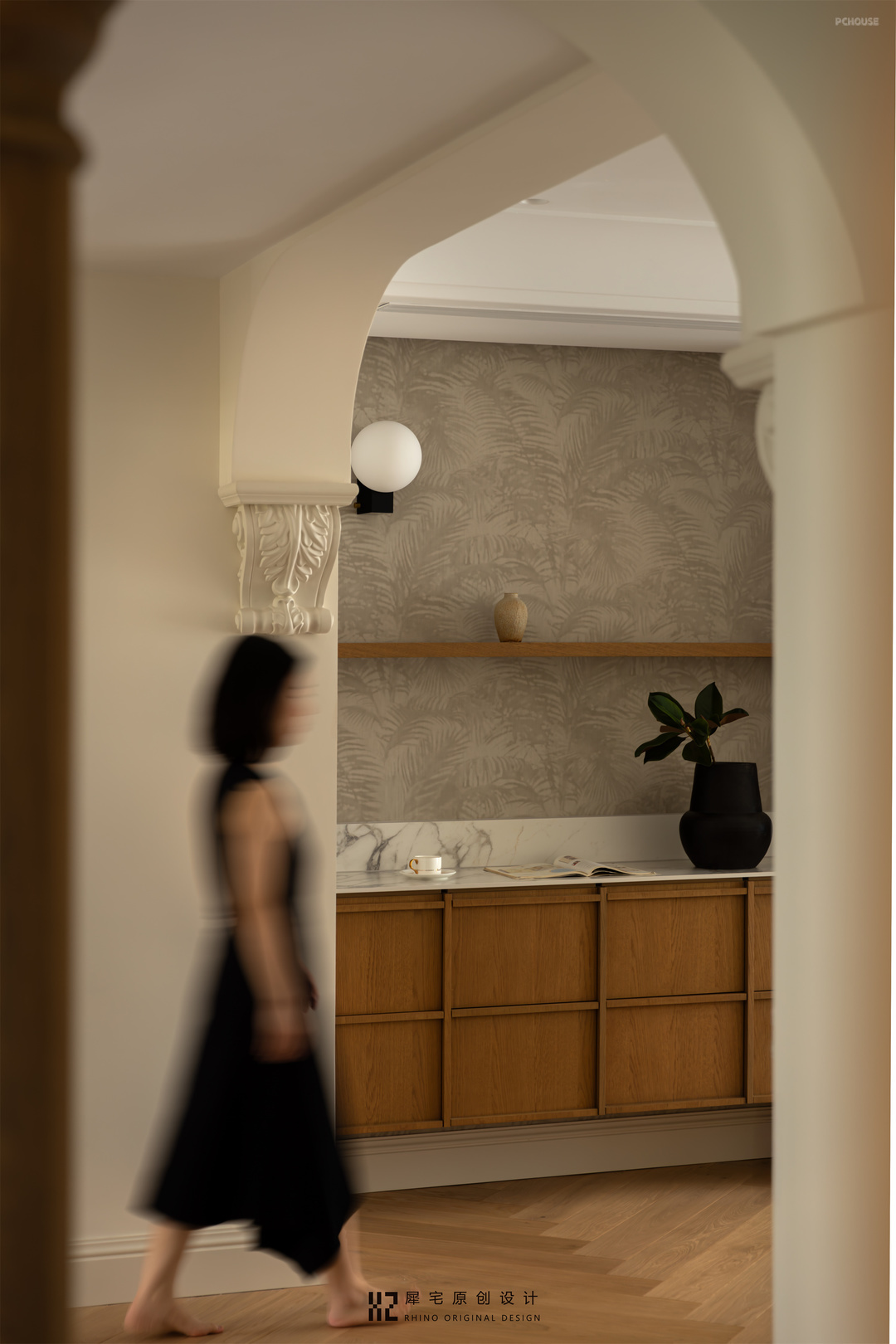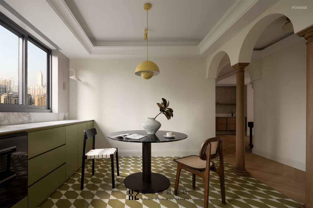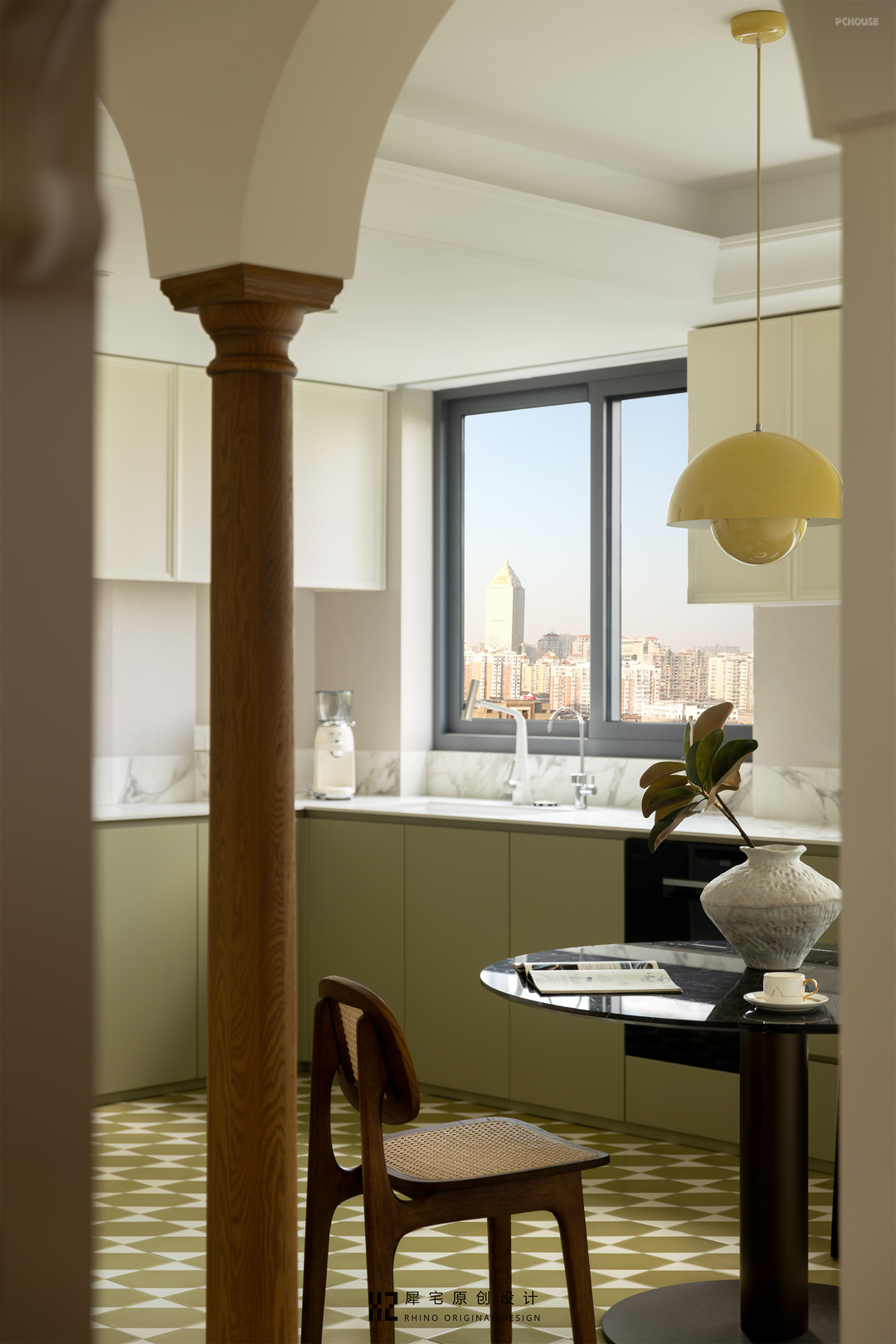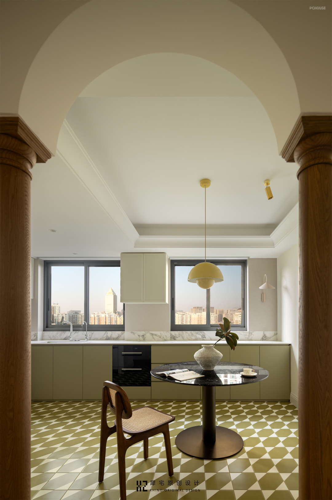 厨房与餐厅打通,形成一个视野极佳的开放式空间。拱券与立柱既起到划分餐厨区和过道的作用,又增添了空间的艺术格调。