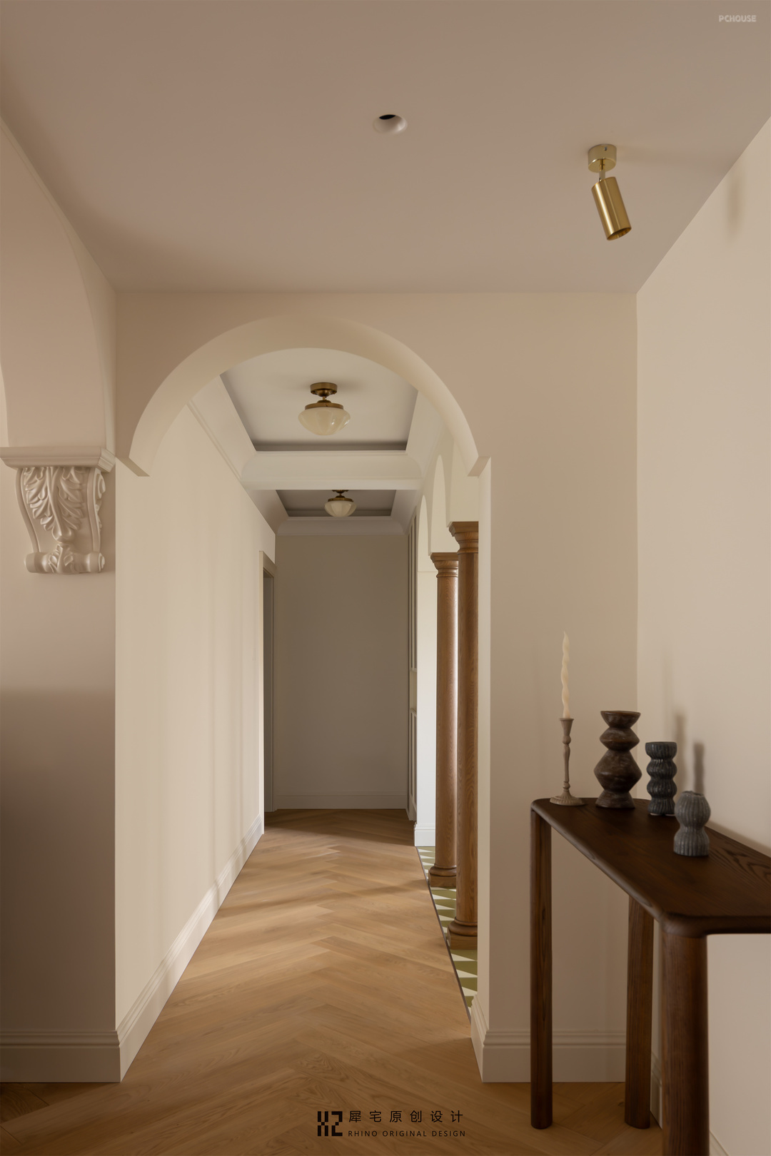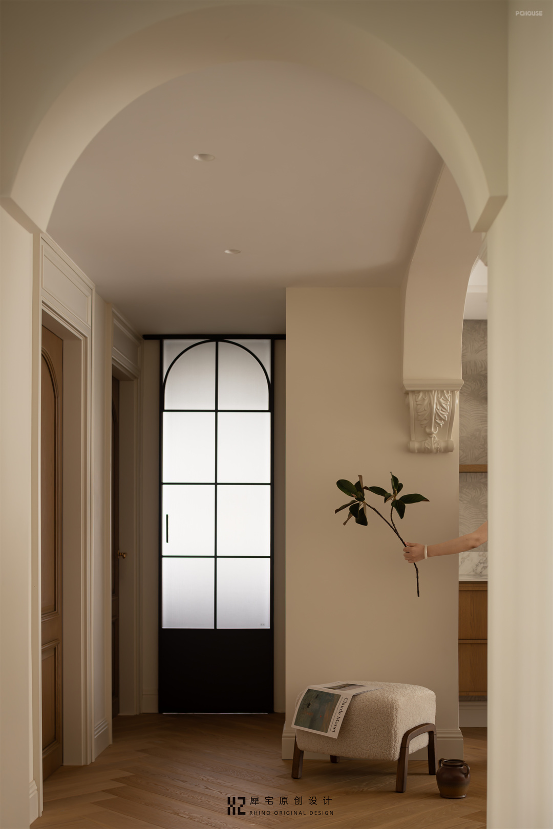 整个空间融合了古典与现代元素,拱形门廊、装饰柱和雕花设计,搭配温柔复古的色调,让人仿佛置身于一座优雅的法式宫殿。
