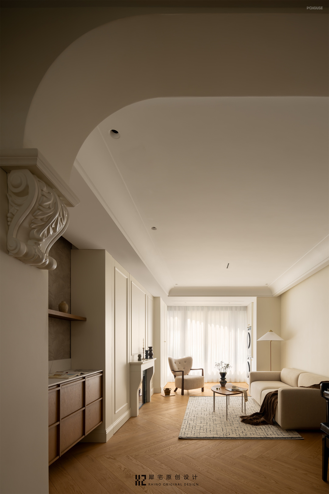 客厅巧妙融合了古典与现代元素,拱形门廊和精致的壁炉,瞬间让人穿越到欧洲古老城堡,而简约的家具和柔和的色调,则为空间增添了一份现代的舒适感。