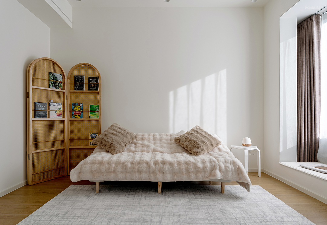 床头背板嵌入进墙体里,并在两侧预留电源。晚上阅读时可以打开床头的灯光,上返的光线柔和不刺眼。
