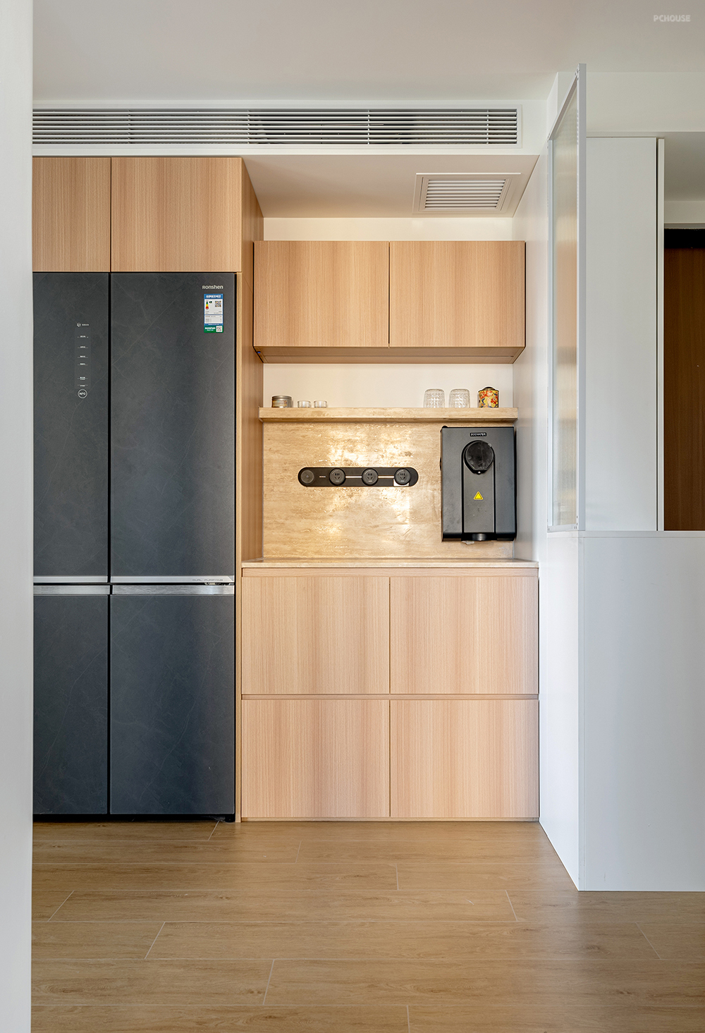 餐边柜水吧台区域是家里不可缺少的一角,深度做到60cm。可以嵌入冰箱,同时右侧的台面和地柜都能提供更多的收纳。上方台面上返到墙面50cm高的位置,并做了杯子摆放的洞石隔板。吊柜的上方留出空间,方便空调检修。