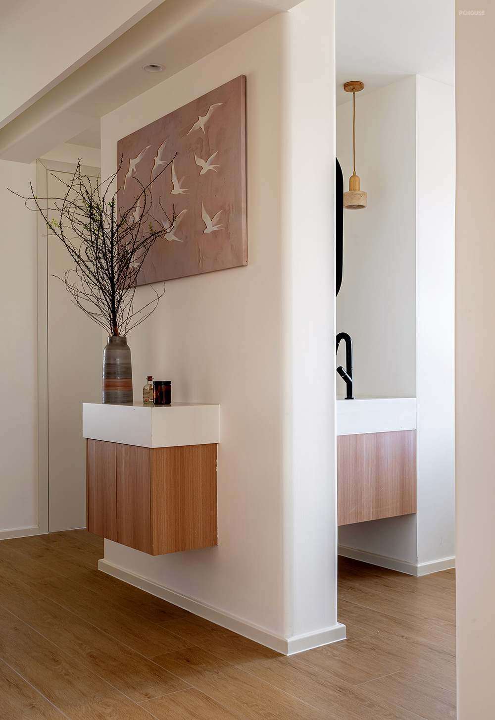 进门正对着一处景端,由木色柜和奶白色石材组成的悬浮柜,只做了30cm的深度。主要是为了隐藏弱电箱,上方的挂画遮挡了强电箱。