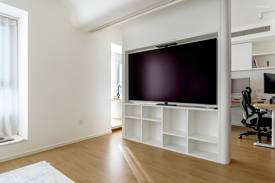 一通到顶的电视墙,中间放置电视的柜子可以360度旋转,两组空间均可使用,全方位无死角观影实在太爽了!