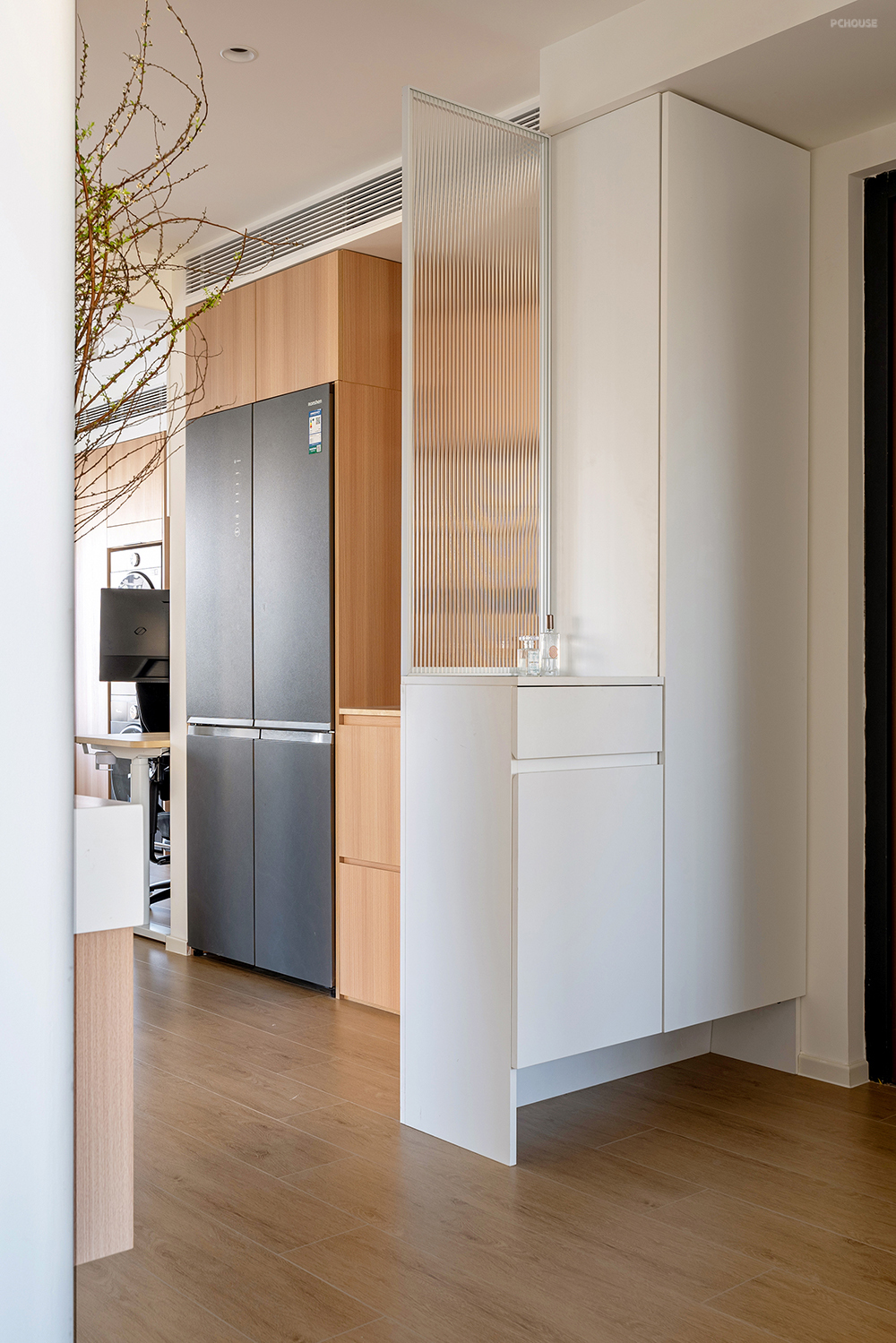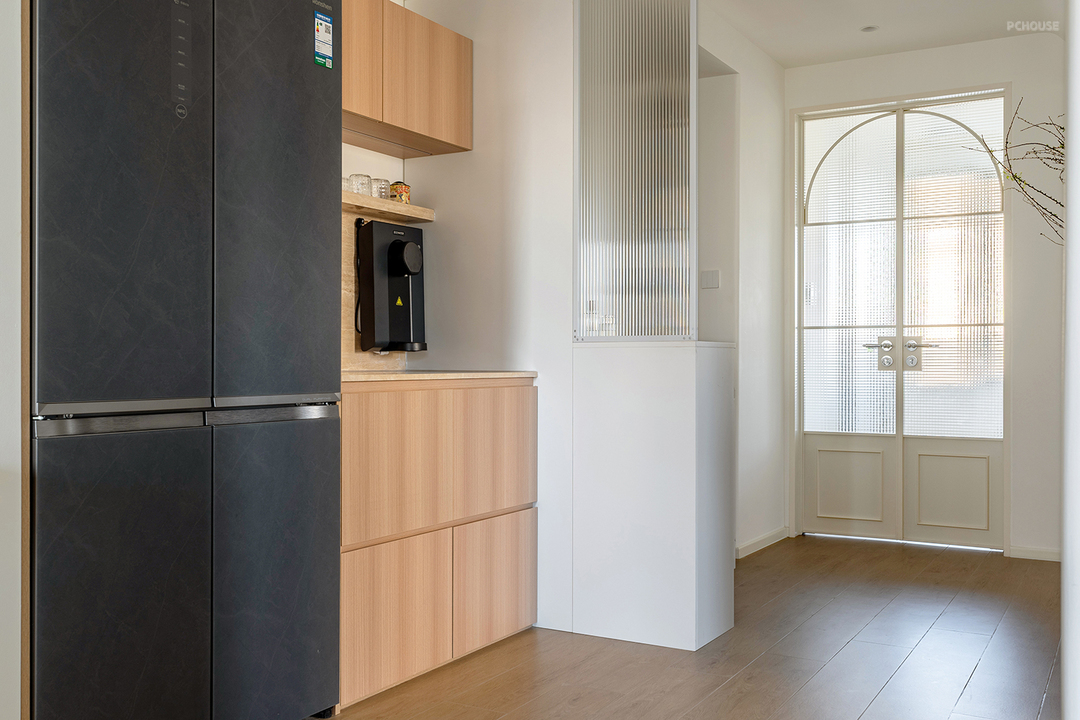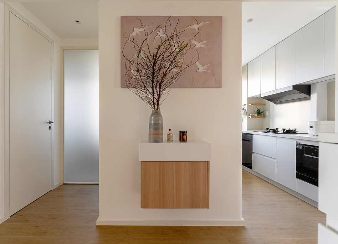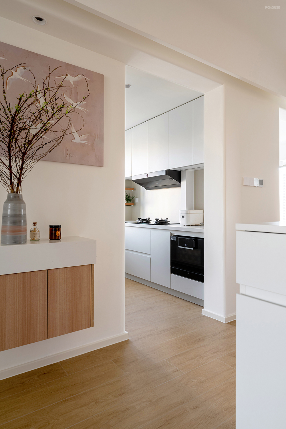 景端入口是厨房,形成顺畅自然的丝滑动线。视觉上拉伸空间,让原本不大的走廊释放感更高。