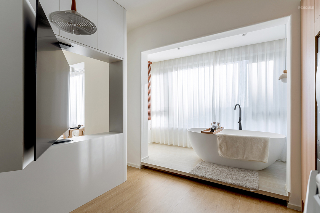3.在阳台区域放置浴缸,解决卫生间空间小无处安放的问题。干湿分离处与厨房打通,做悬浮洗手盆。