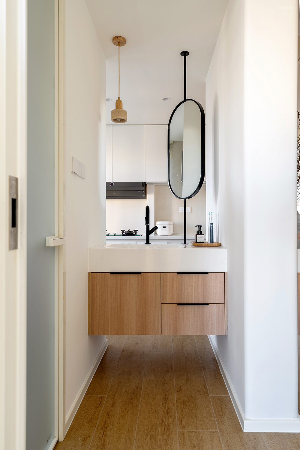 卫生间干区做悬隔断柜,台面做了下挂设计,让整体视觉有横向延伸的感觉。在干区洗漱的同时,可以和正在做饭的人进行互动,家庭的交流属性和幸福感被直接拉满~