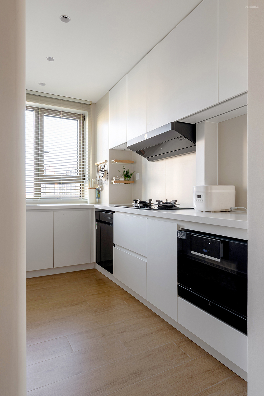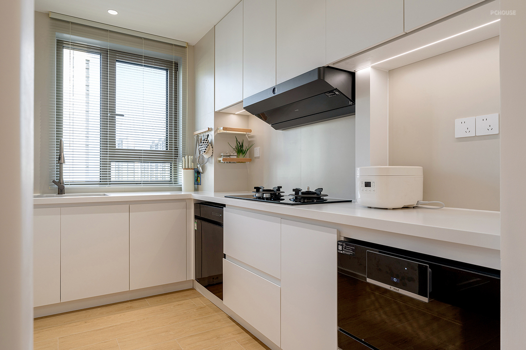 L型的操作台,遵循洗、切、炒、盛流畅的操作动线。白色的无把手橱柜与环境融为一体,营造明亮简洁的空间氛围。