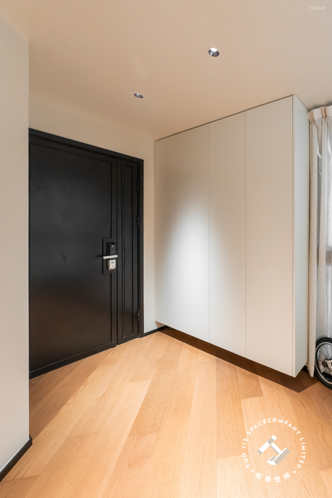 玄关是一个独立的门厅,且是个异形的格局,靠墙定制悬空的鞋柜,另一边是个隐形的储物间,简洁大气的线条配上轻盈的视觉效果,提升了整体空间的档次。
