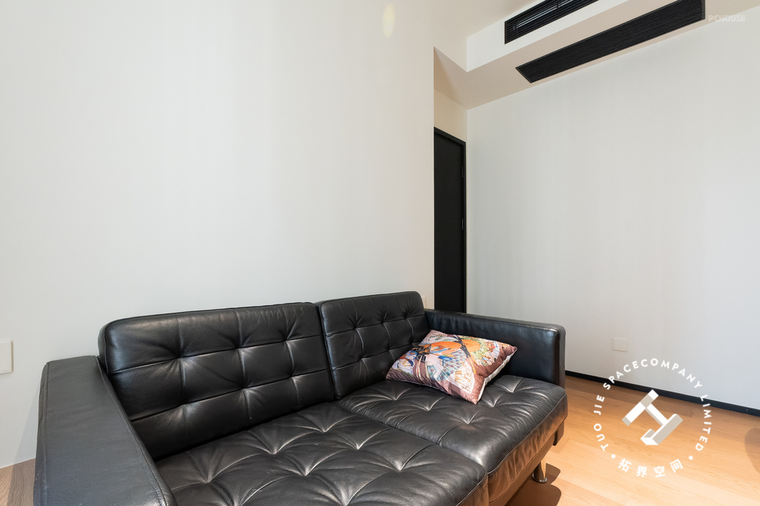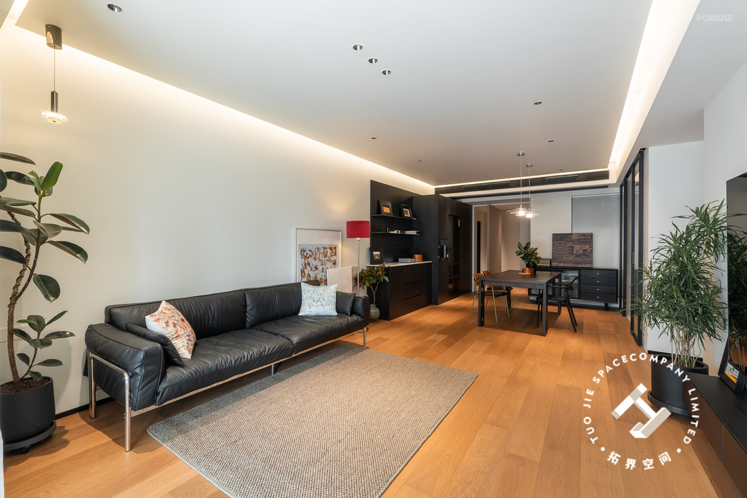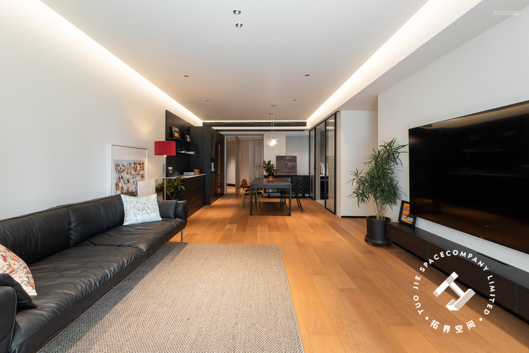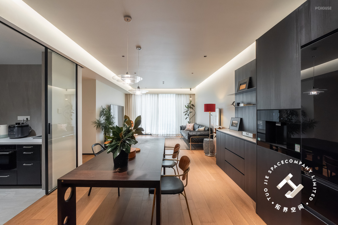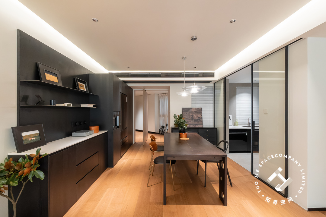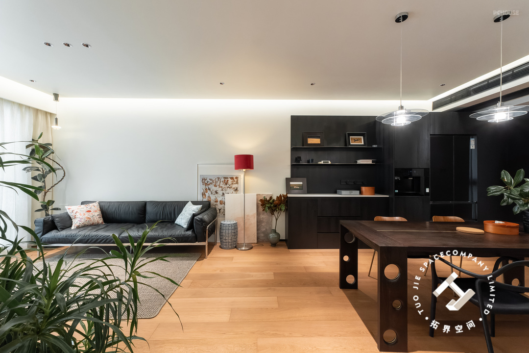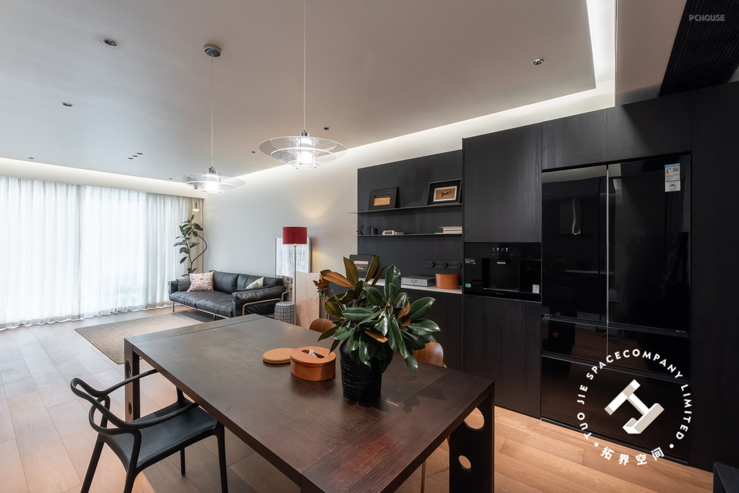 全屋地面通铺木地板,顶面设计悬浮吊顶,大部分的黑色系家具搭配,散发出温馨又高级的魅力,空间也尽显明亮开阔的居家氛围。
